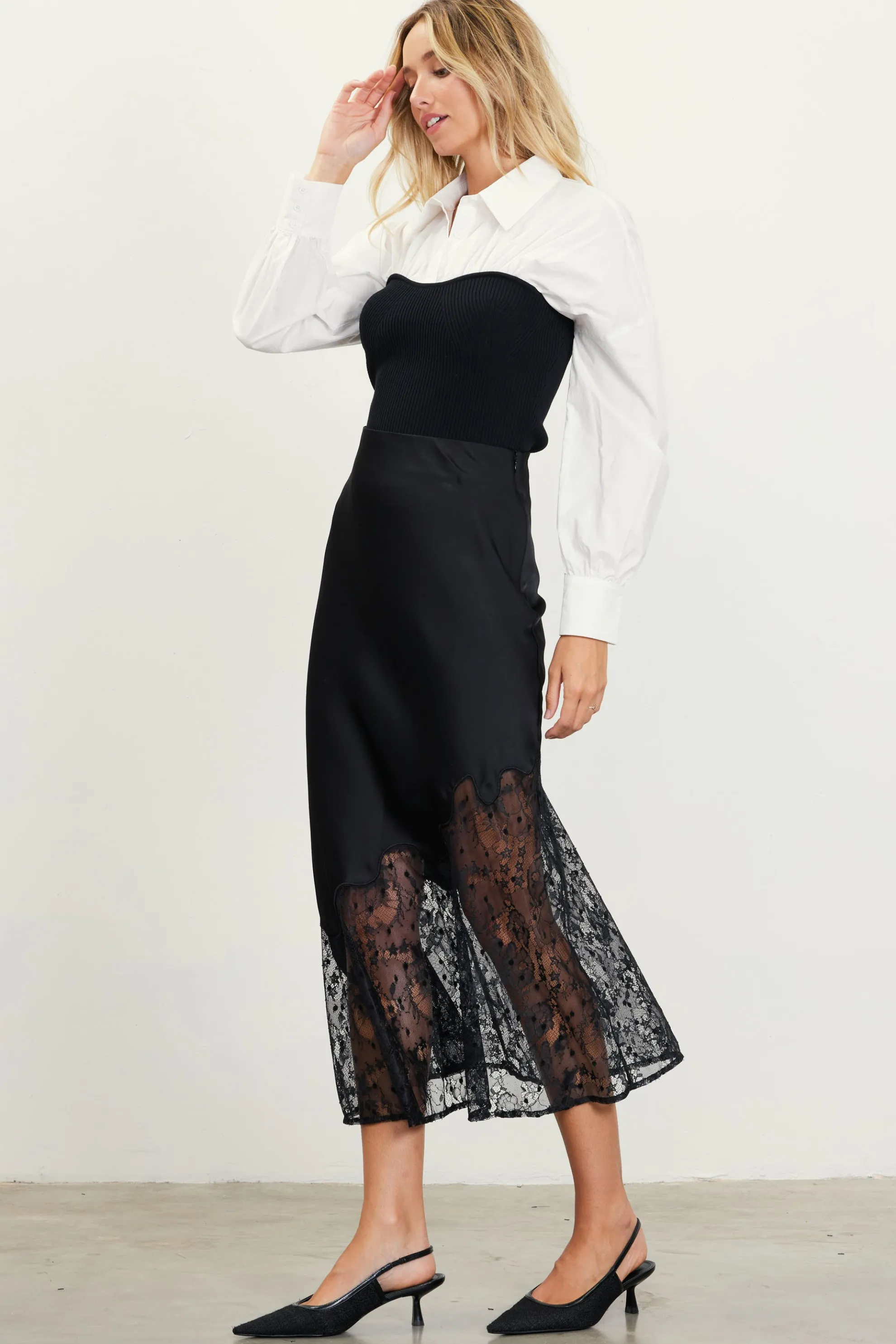 This black satin midi skirt features winding seam detailing and asymmetrical lace piecing for an alluring reveal. Sleek and comfortable with a concealed elastic waist, it’s cut on the bias in a fluted silhouette that glides along the figure and flares out at the hem.