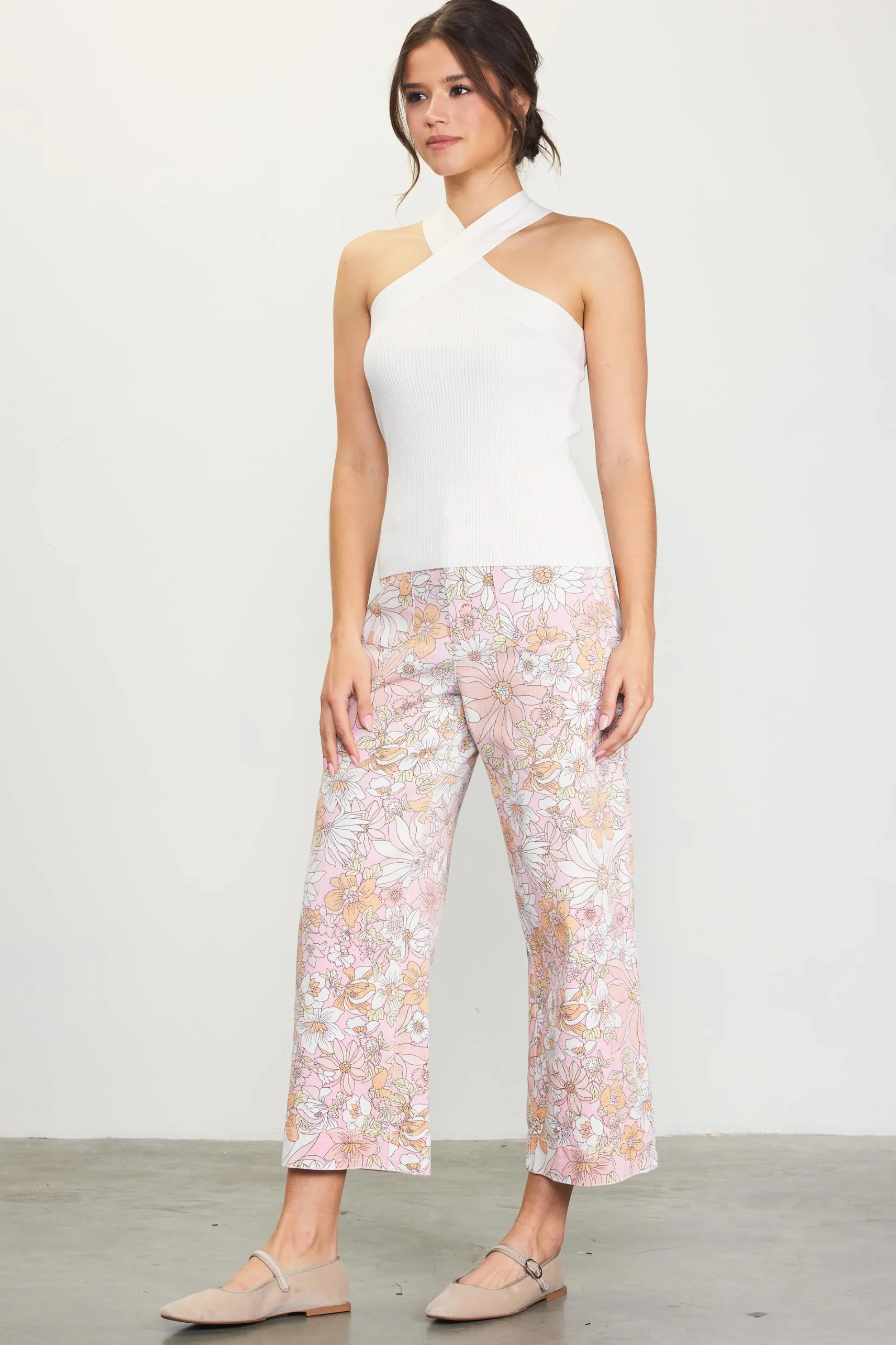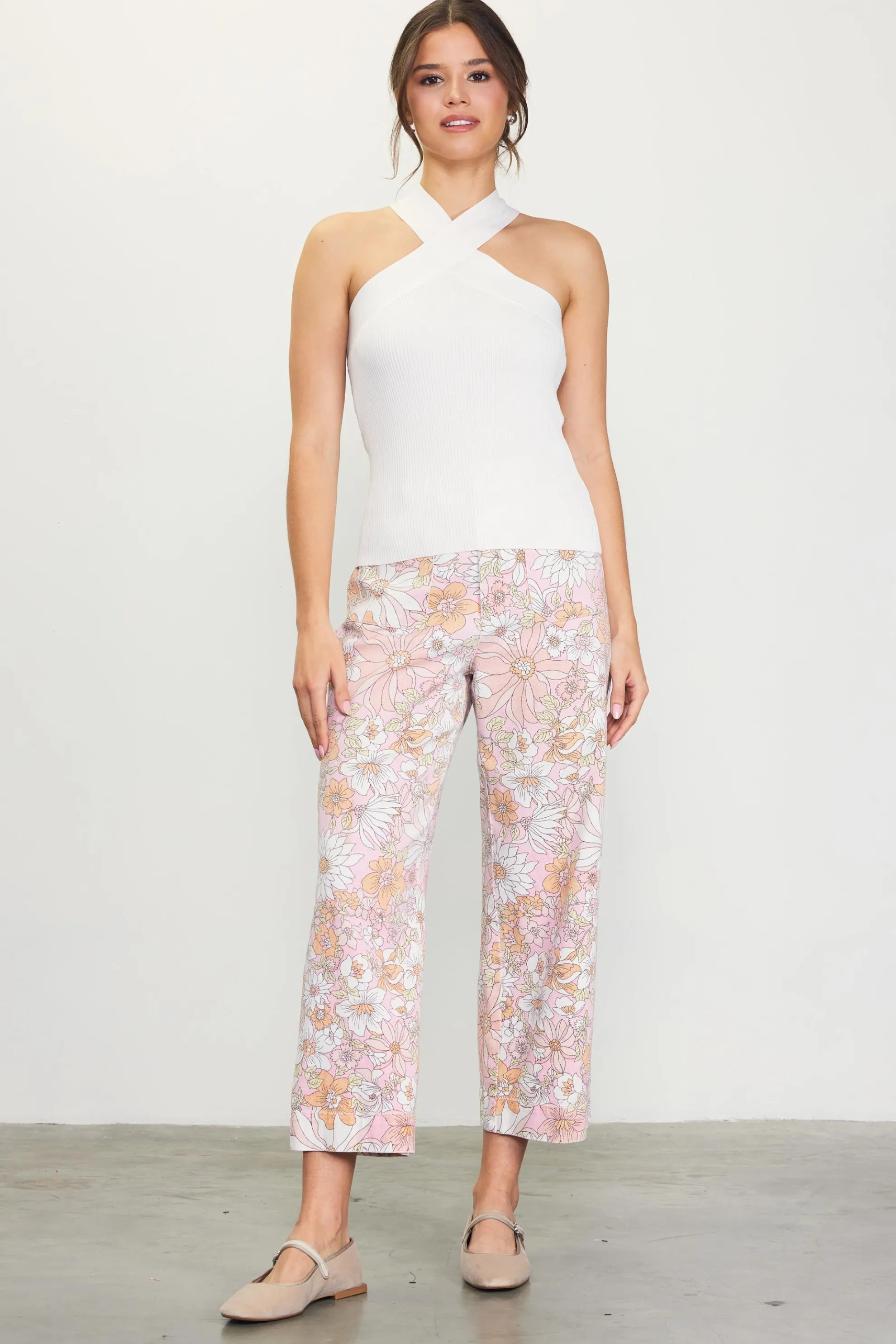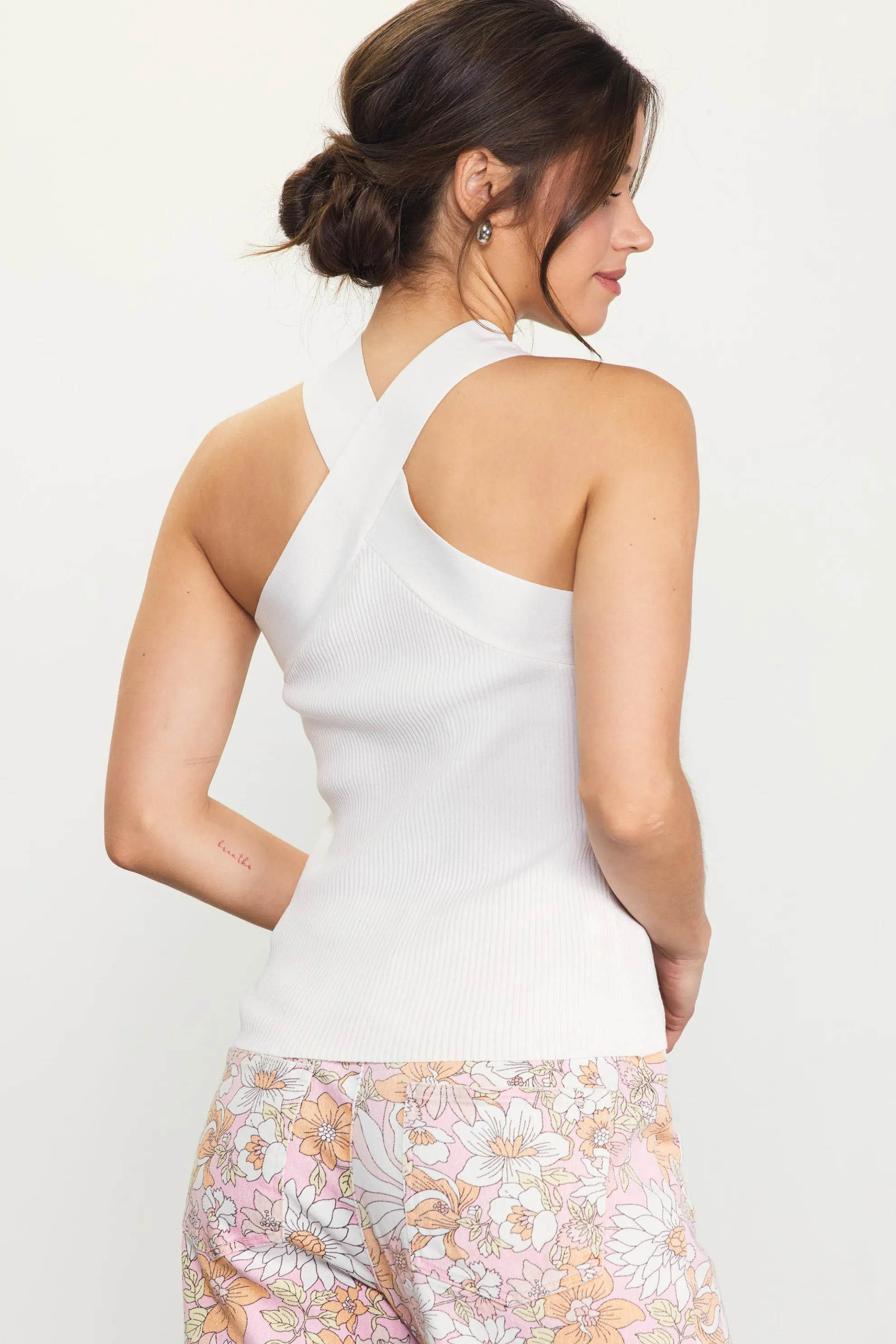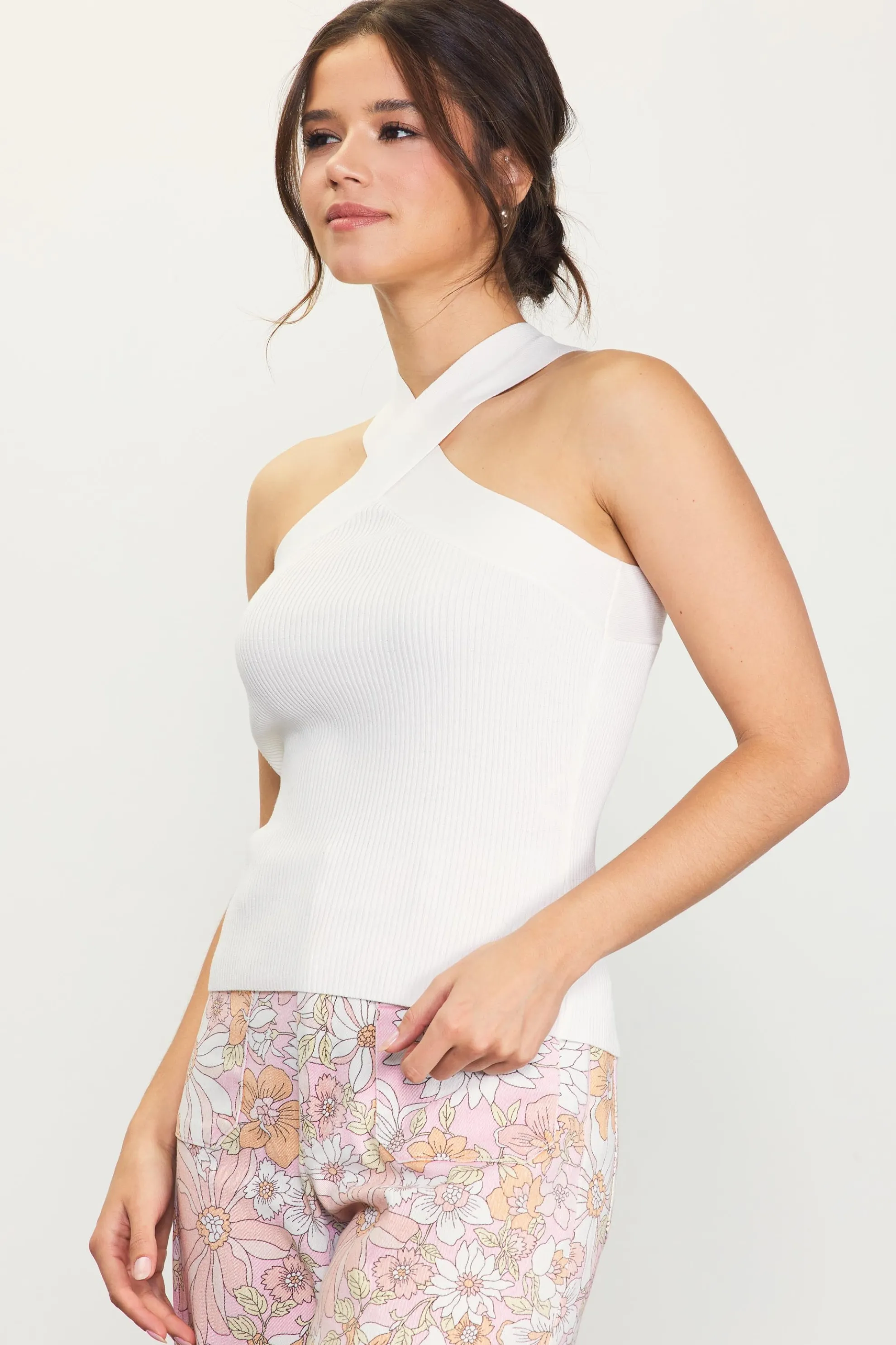 A crisscross neckline creates a sexy halter silhouette on this fitted sweater top. It’s made from a ribbed knit that hugs the body and feels exceptionally comfortable.