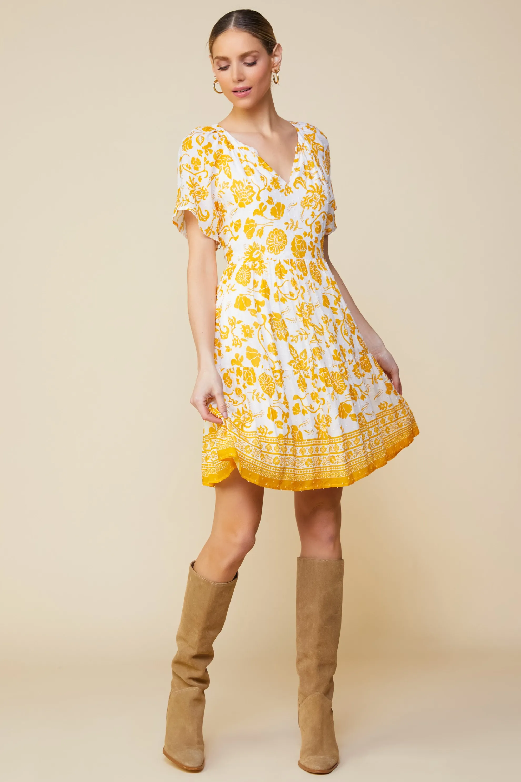 This printed babydoll dress is the embodiment of summer. It’s sunny and easy, designed in a textural swiss dot fabric with a marigold floral print and a geometric border at the hem.