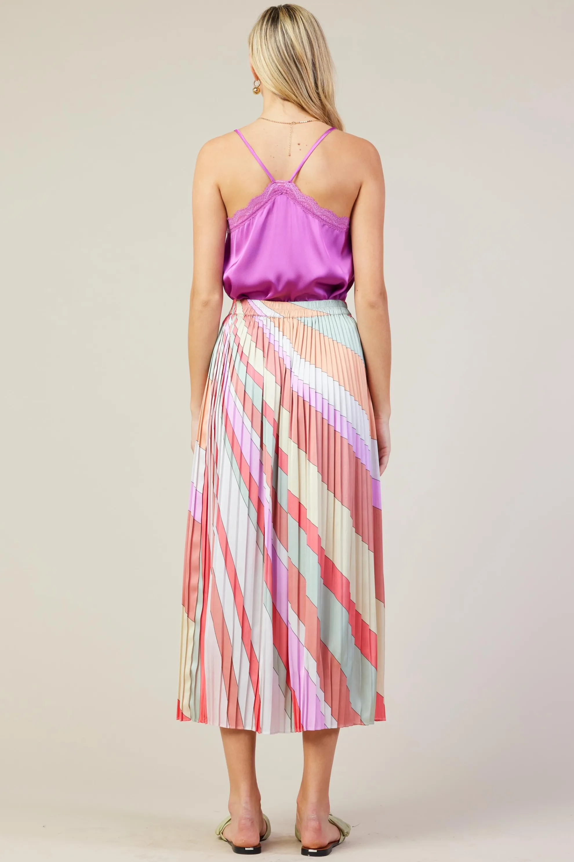 This pleated midi skirt hosts a swirl of diagonal stripes in pastel hues. The style has tons of movement, plus an elasticized back waist for added comfort.