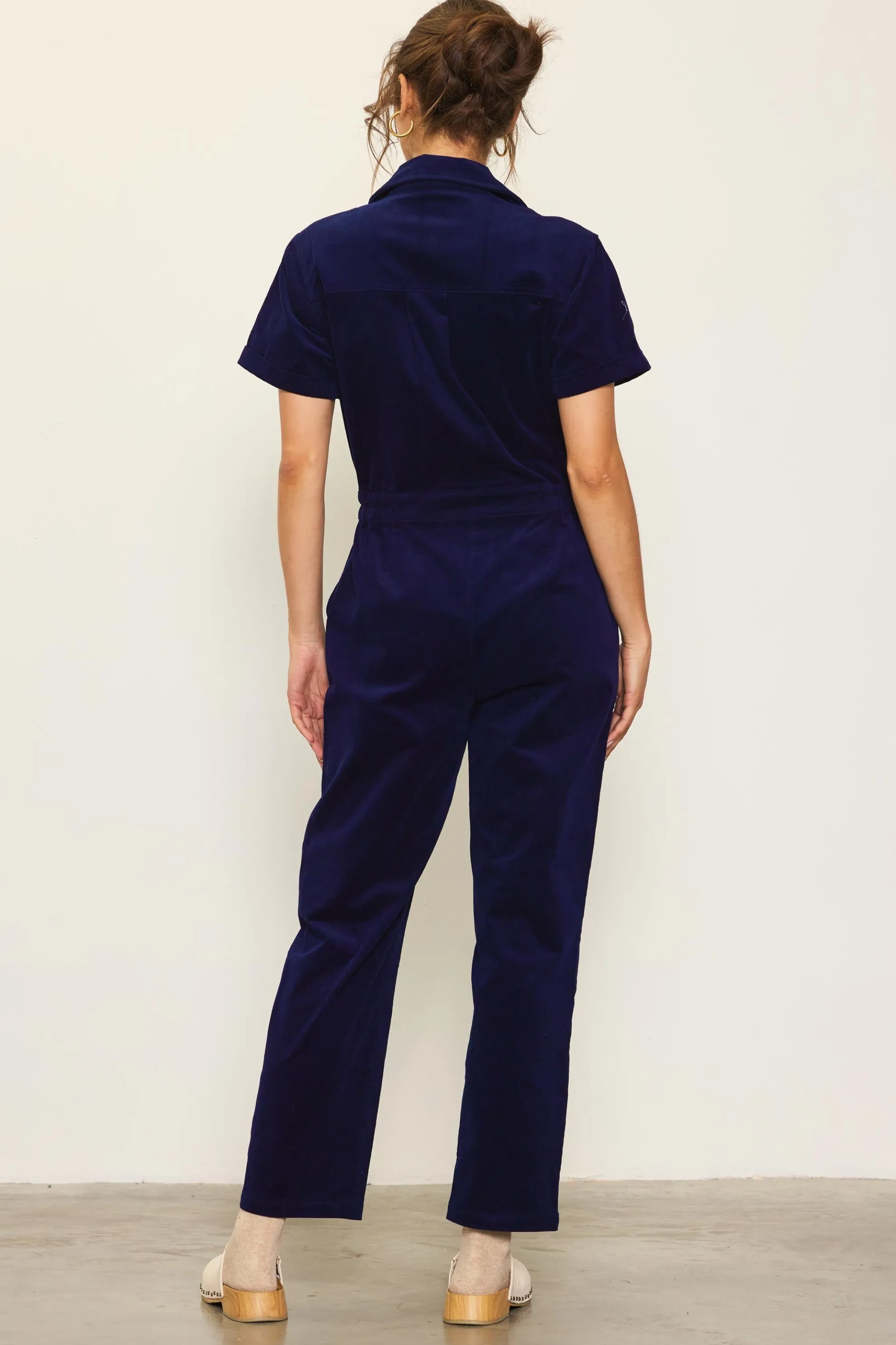 Plush corduroy adds a luxe texture to this utility-inspired jumpsuit. Cut for a short-sleeve silhouette, this straight-leg style has workwear-esque patch pockets, buttons at the front, and a partially elasticized waist.