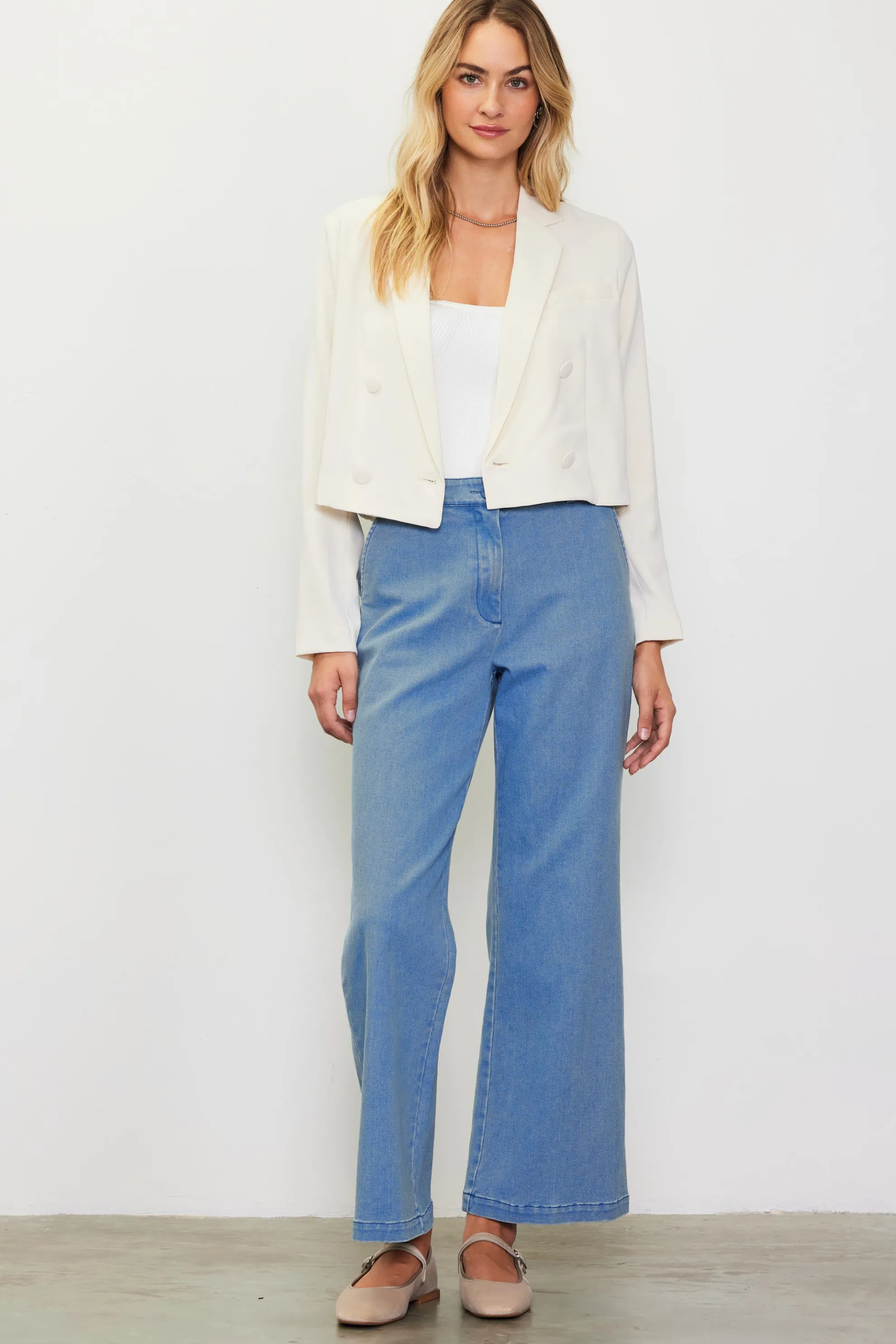 A double-breasted blazer elevates your ensembles with a tailored touch. It’s cropped and boxy, showcasing notched lapels, a single chest pocket, and covered buttons at the front. Add a matching pair of wide-leg pants for a look you can take to work or out to dinner.