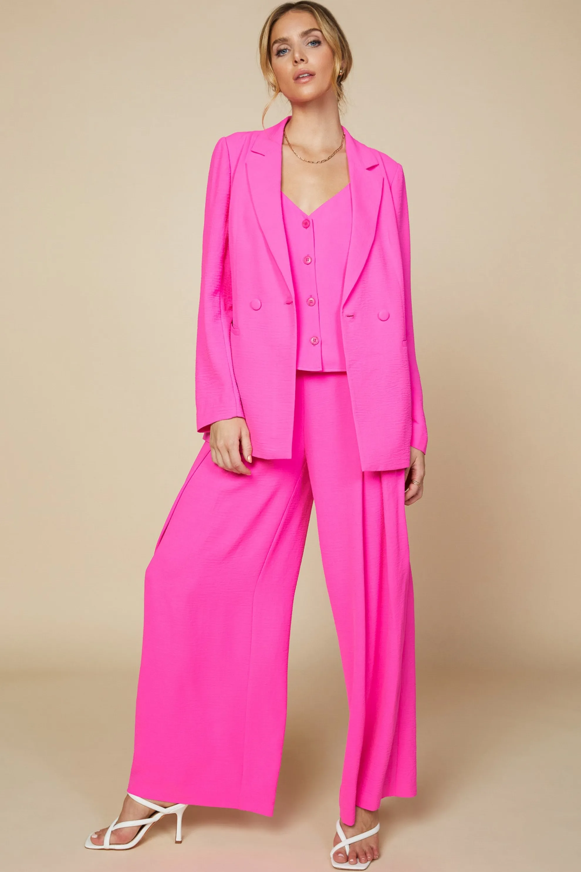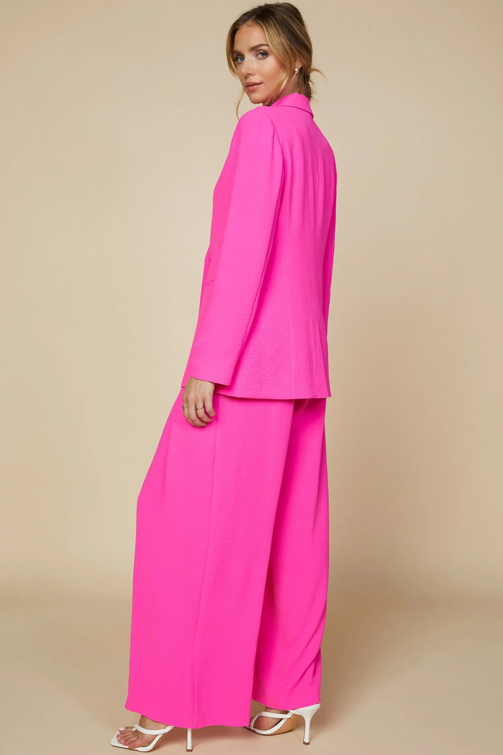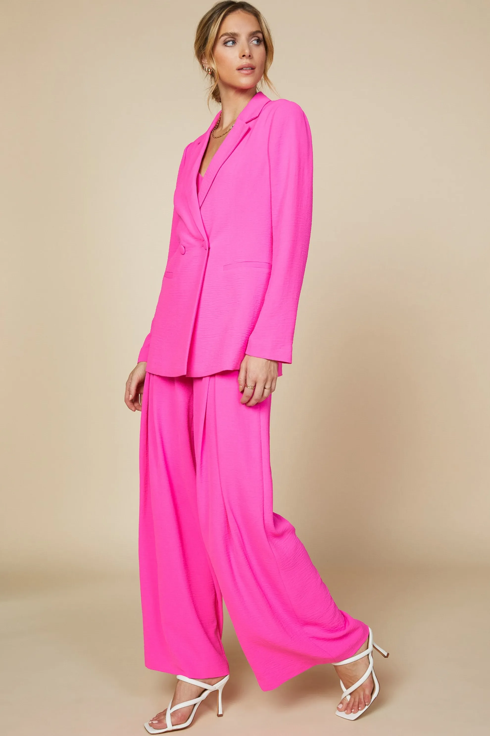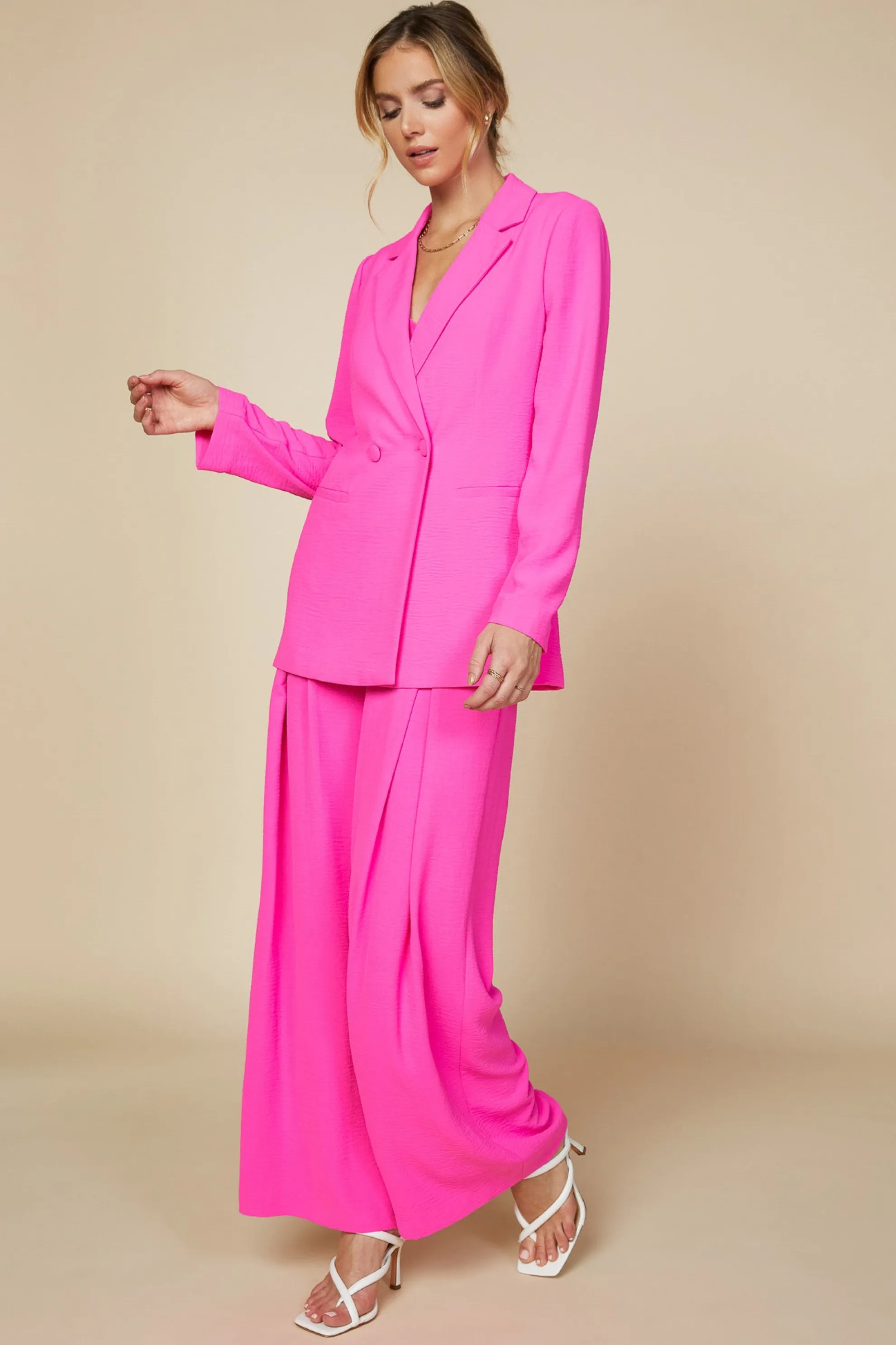 A double-breasted blazer in a vivid fuchsia shade is the pop your wardrobe needs. Designed with notched lapels and flap pockets, this tailored jacket pairs naturally with tonal coordinates and contrasts beautifully against denim.