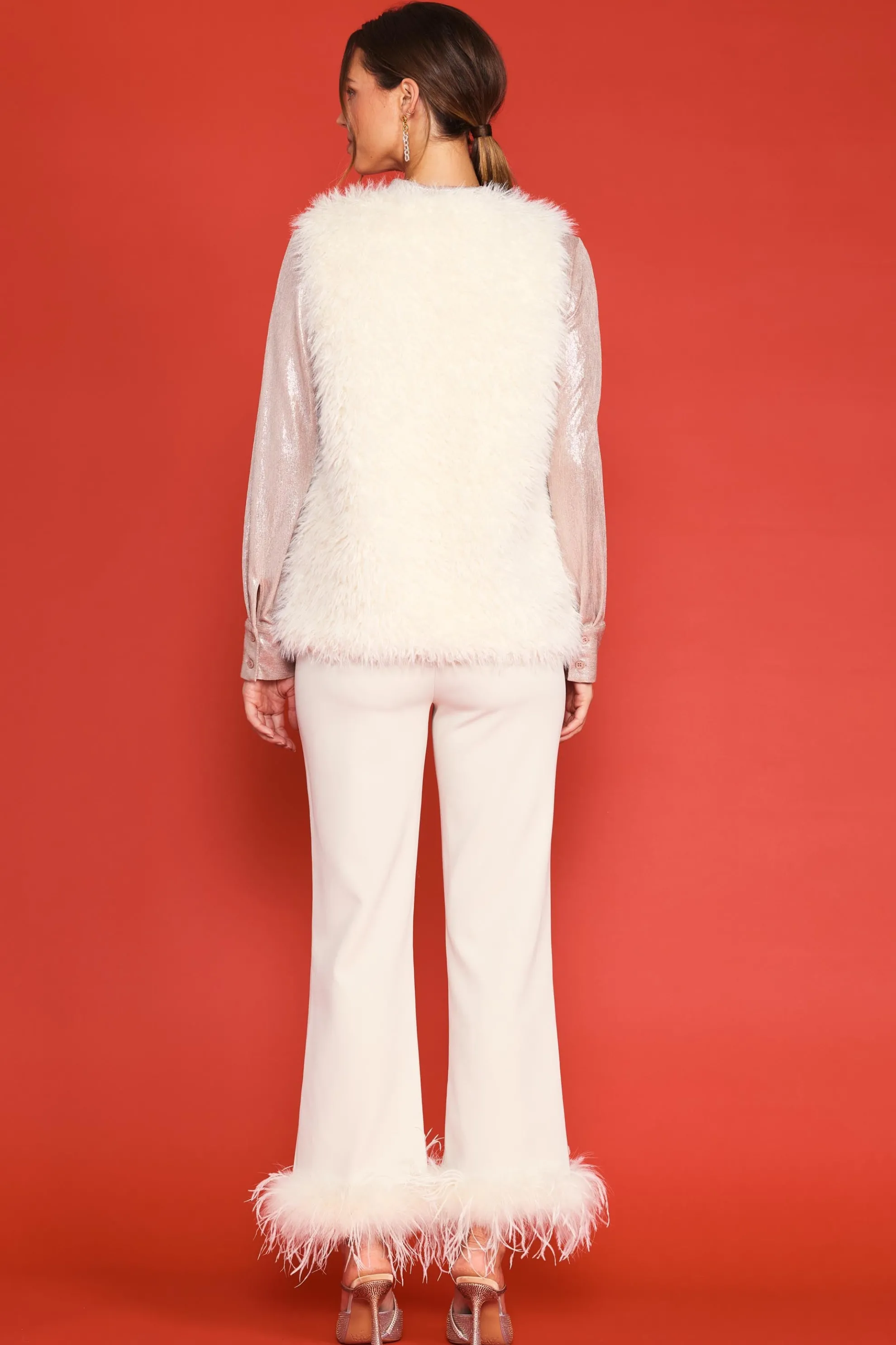 Stay warm and cozy by slipping on this cream-colored faux fur vest. It’s a texture-rich addition to any outfit.