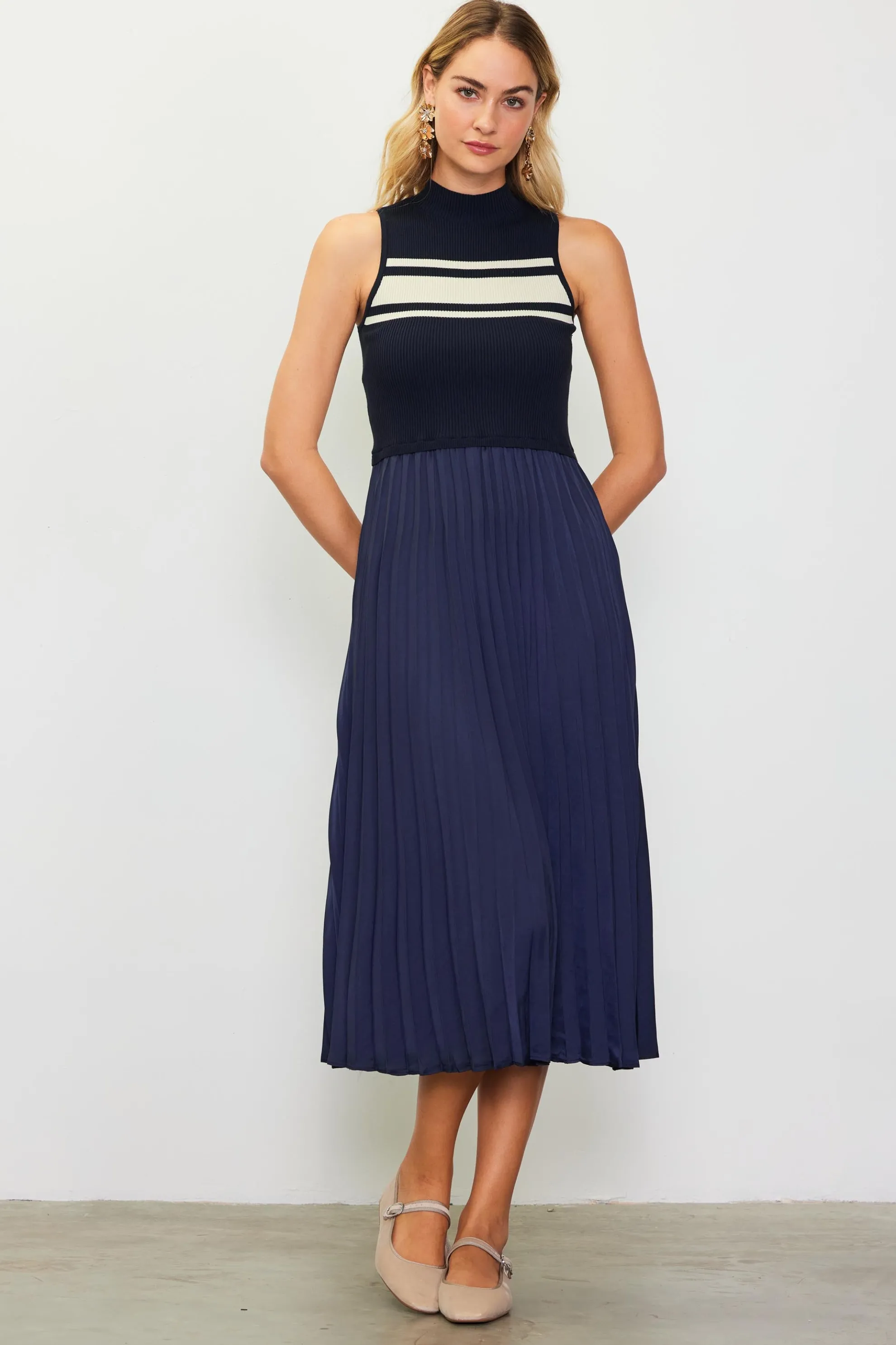 On top, this mixed-texture dress features a sleeveless mock-neck sweater top in a navy ribbed knit with cream stripes. Down below, the mid-length woven skirt falls to swishy pleats. Pair it with sneakers or boots during the day and dress it up with heels at night.