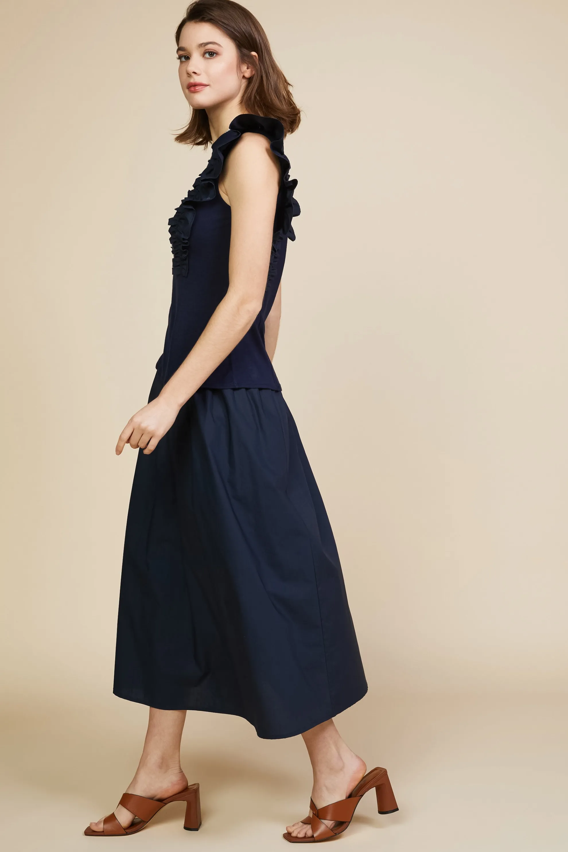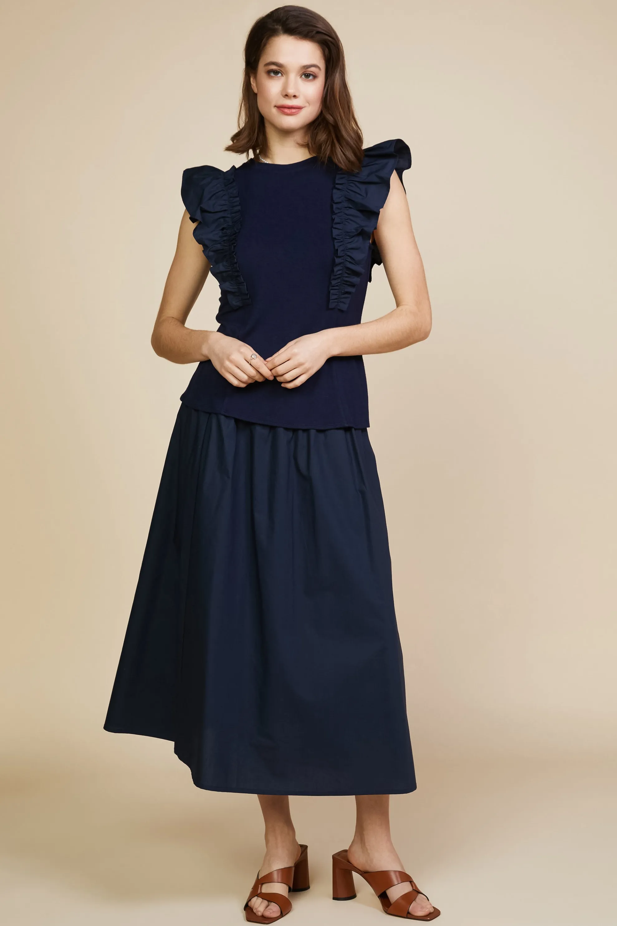 This knit tank has woven ruffle trim that creates a dramatic silhouette. It’s as comfortable as your favorite tee, but more fun and feminine.