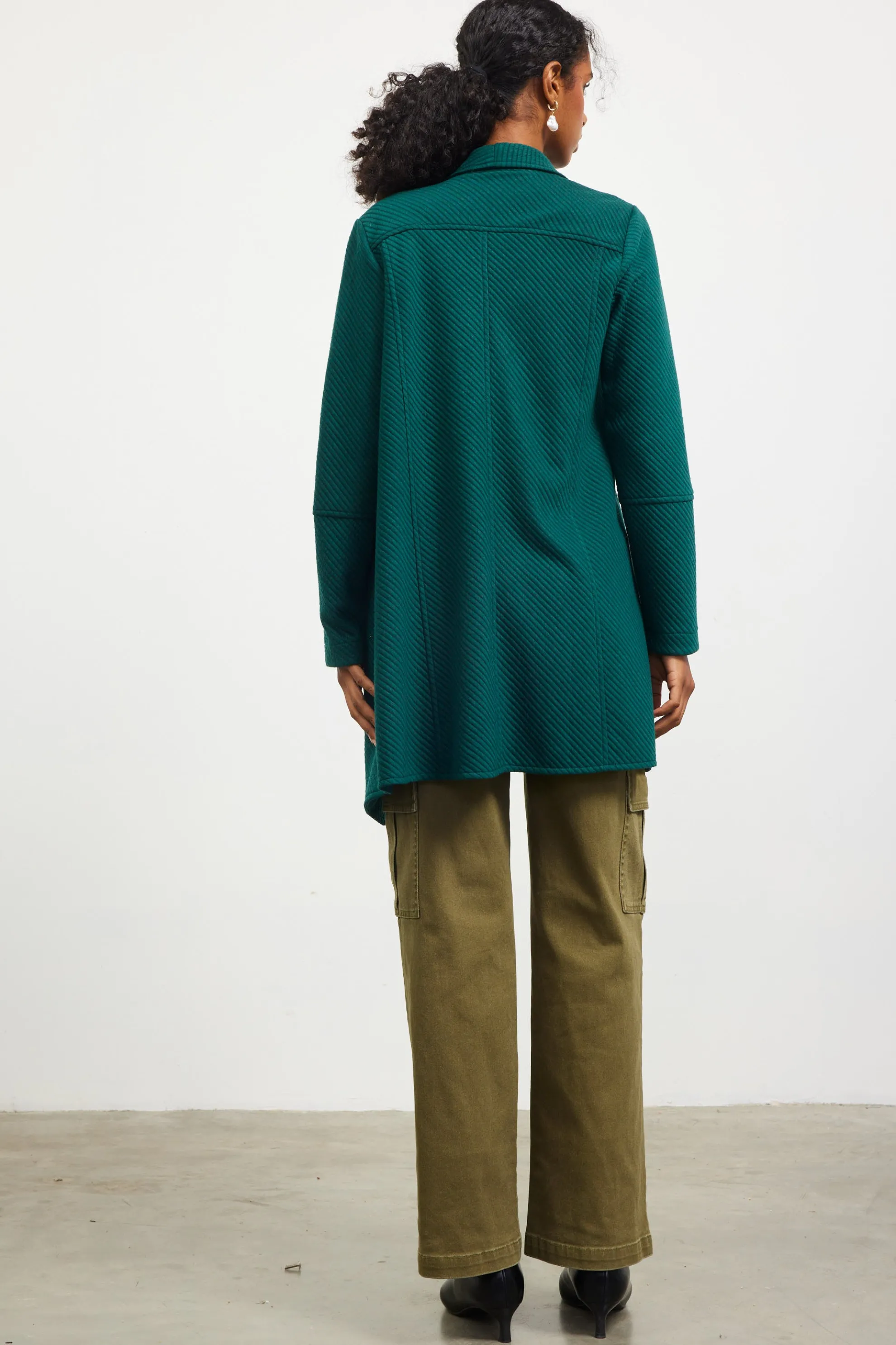Throw on this open-front cardigan at the slightest hint of chill. Made from a quilted knit, it’s got longer lines, paneled sleeves, and an exaggerated collar for a modern statement.