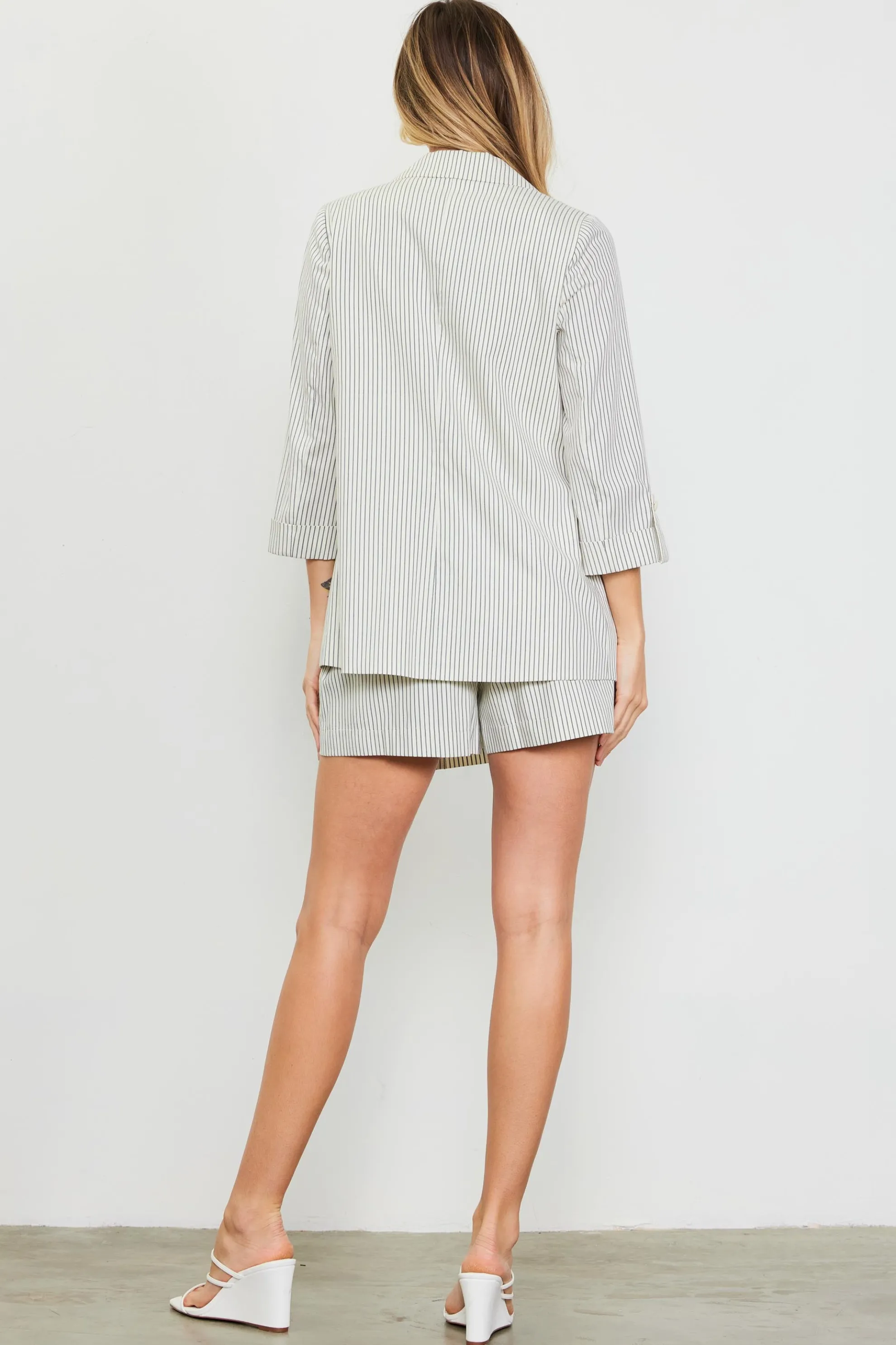 A summer-ready pinstriped blazer with rolled sleeves in an abbreviated length. The open-front style is tailored for a relaxed fit with structured shoulders, notched lapels, and handy flap pockets. Style it with jeans and a tee for casual polish, or add our matching pinstriped romper or skort to create a coordinating set.