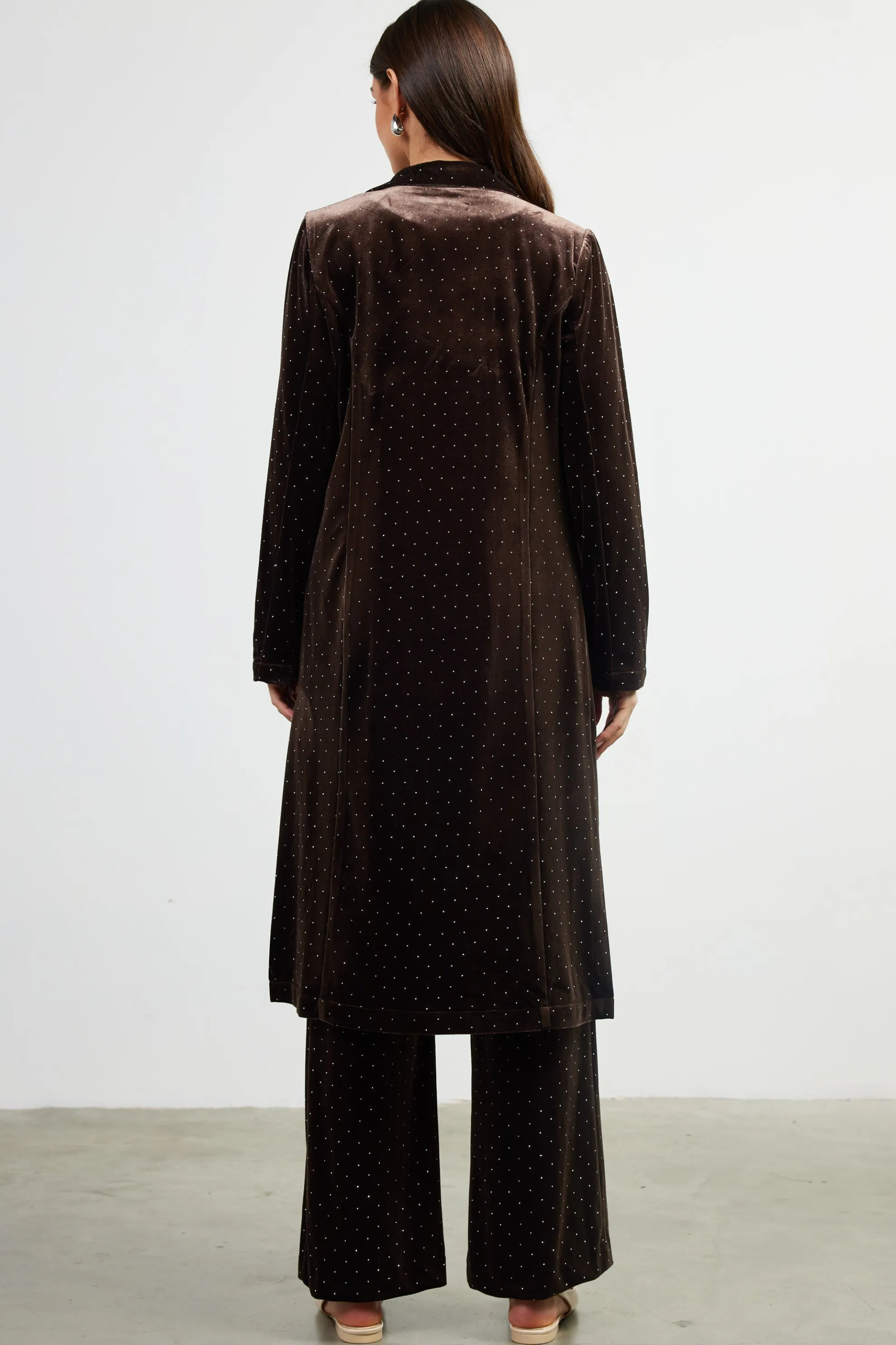 Between the rich texture and tiny shimmering rhinestones, this velvet duster elevates anything you’re wearing. It’s designed with long lines and slips on with ease thanks to its open front. Tailored elements offer the right amount of structure, while split sides allows for easy movement.
