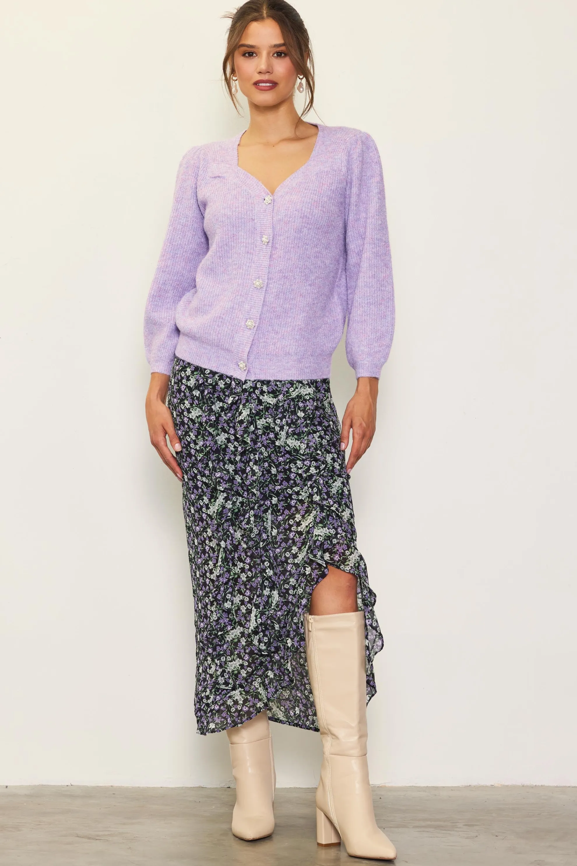 Ruffles cascade down the front of this floral-print midi skirt, adding movement to the shin-skimming silhouette. Made from sheer jacquard that’s woven with a subtle stripe pattern, the style sits high on the waist and features an alluring front slit.