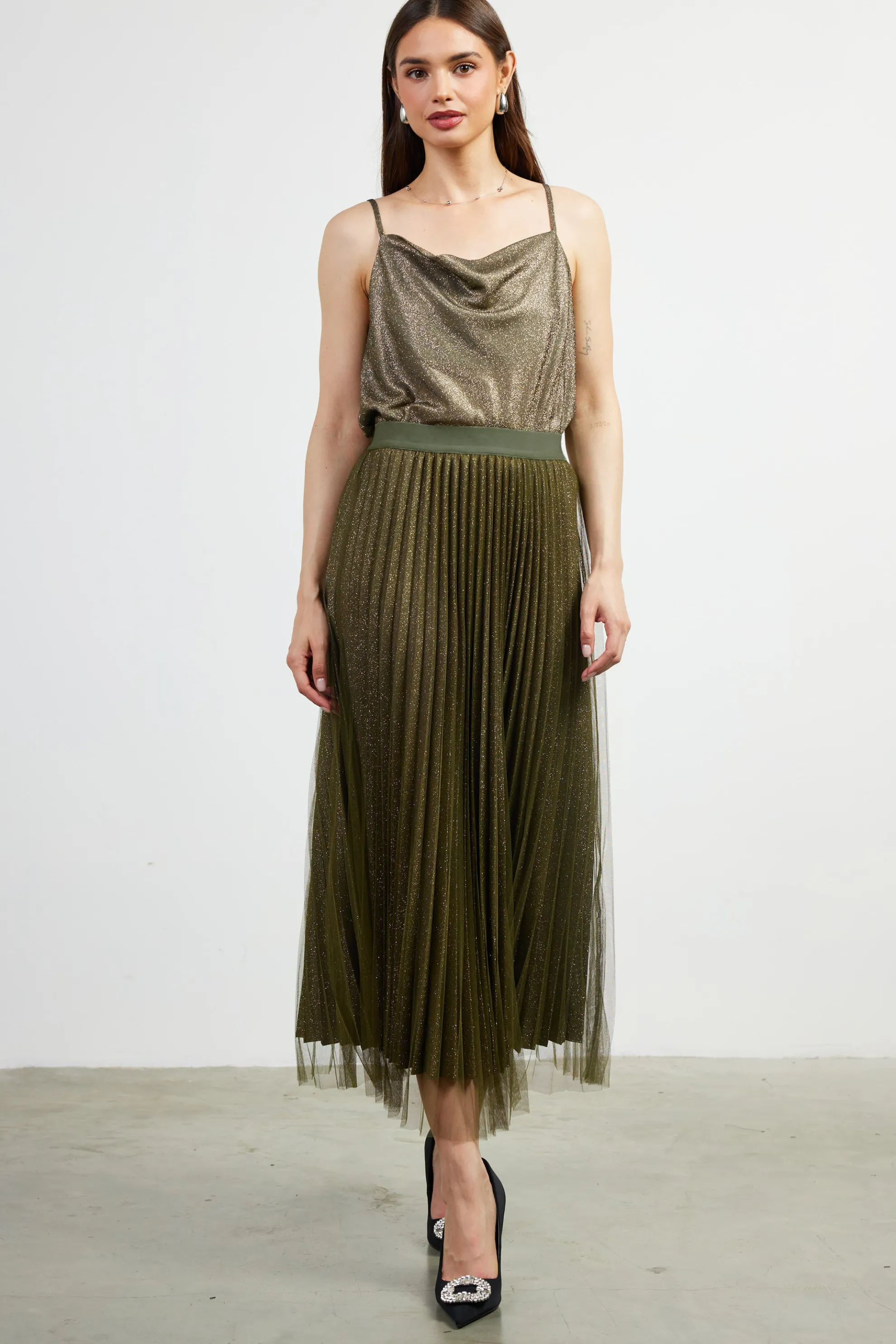 This pleated shimmery midi skirt is overlaid with sheer, delicate mesh for an ethereal look. The pull-on style has a comfortable elastic waistband and raw hems that land at shin length.