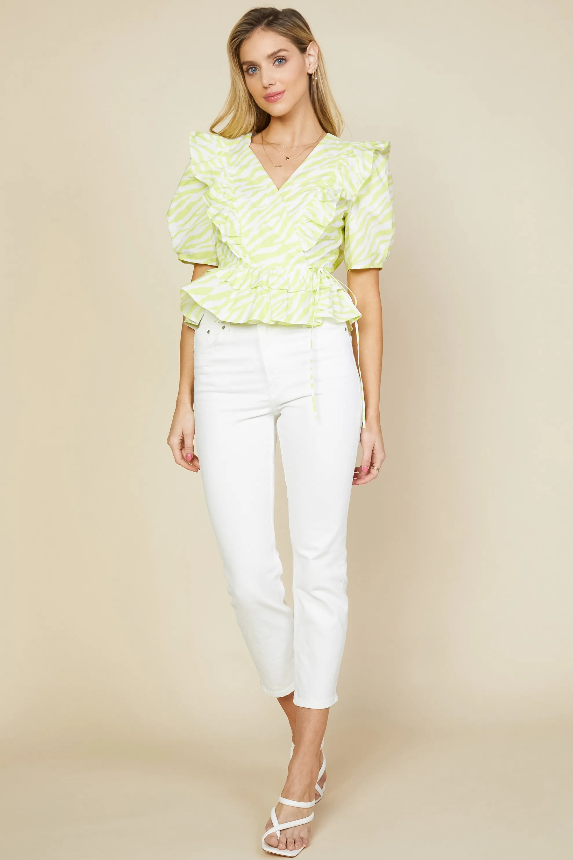 This zebra-print peplum top is all drama, electrified in bright lime animal stripes. It’s got attention-grabbing ruffles and a plunging V-shaped neckline created by the wrap styling that ties at the side.