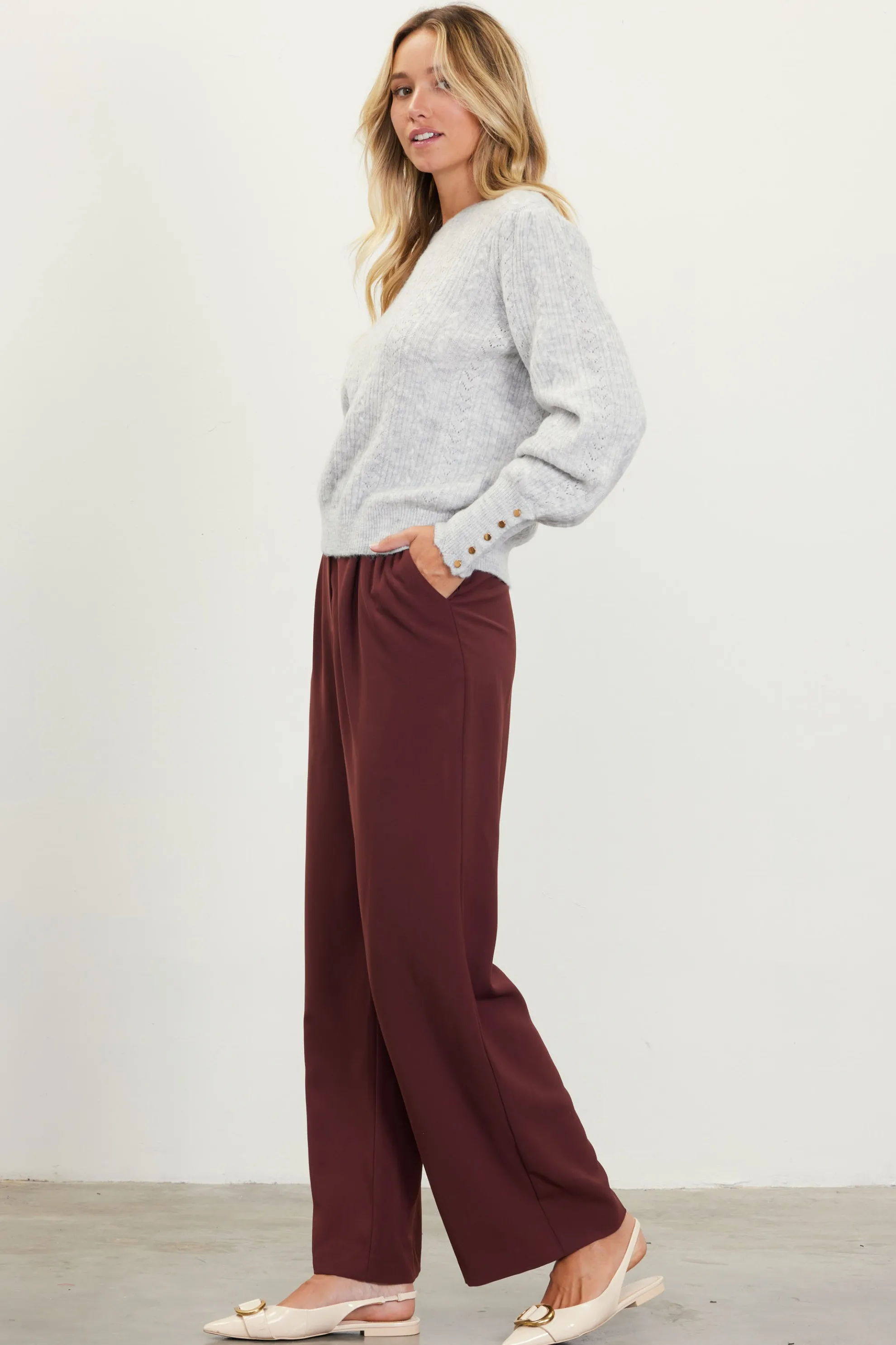 Knitted with a cabled design and pointelle stitches, this long-sleeve sweater has a round neckline featuring wavy scalloped edges. Decorative gold buttons detail the cuffs.