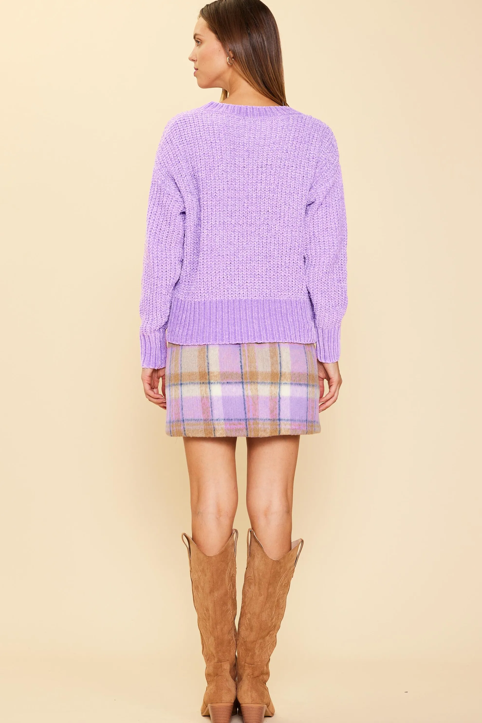 Knitted in luxuriously soft chenille, this sweater has a relaxed fit with dropped shoulders and thick, chunky stitches. It’s incredibly comfy, finished with prominent ribs at the collar, cuffs, and bottom hem.