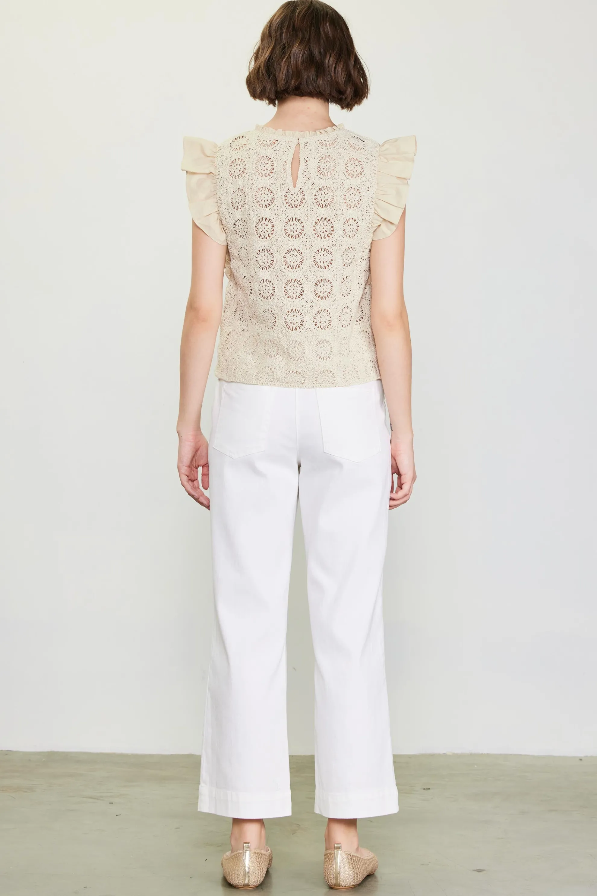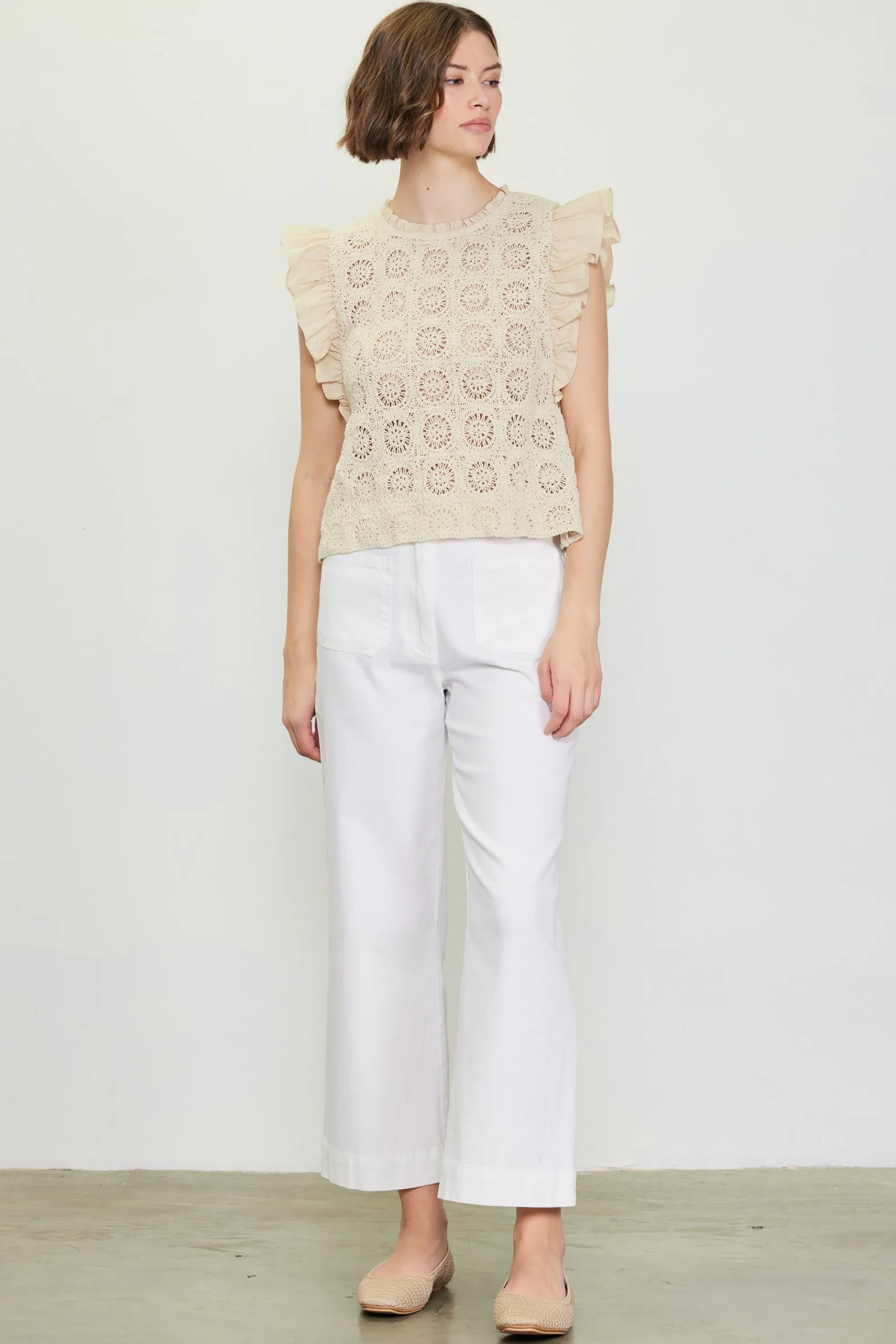 This crocheted top has a slightly boxy shape with lots of texture. Accented by woven trim, it has a ruffled neckline and flutter sleeves for a feminine flourish. A keyhole at the back completes the look.