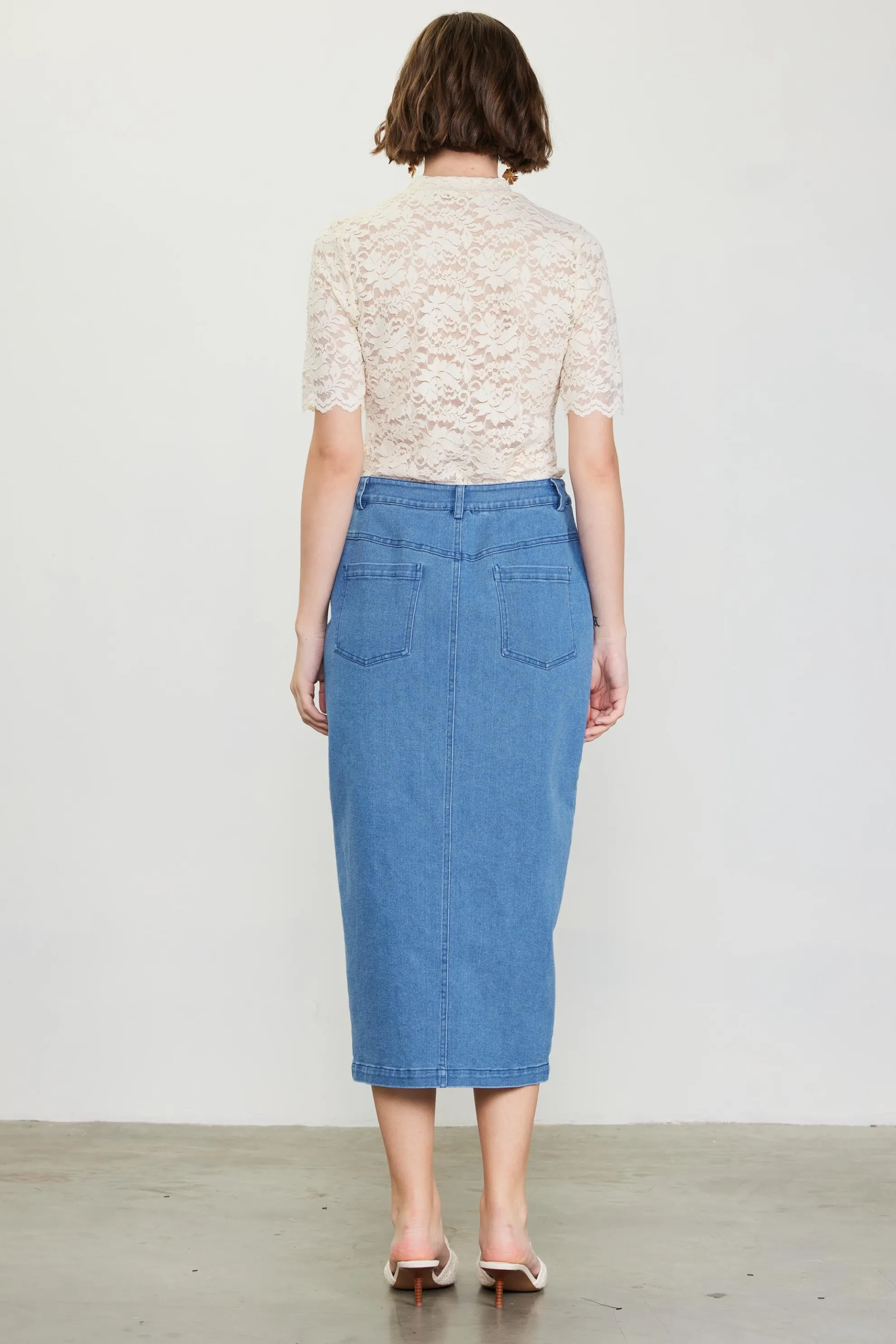 Just like your favorite jeans, there are countless ways to style this denim midi skirt. Done in a light blue wash, it sits high on the waist and buttons down at the front, coming to a shin-length hem. Cargo pockets and a side slit complete the look.