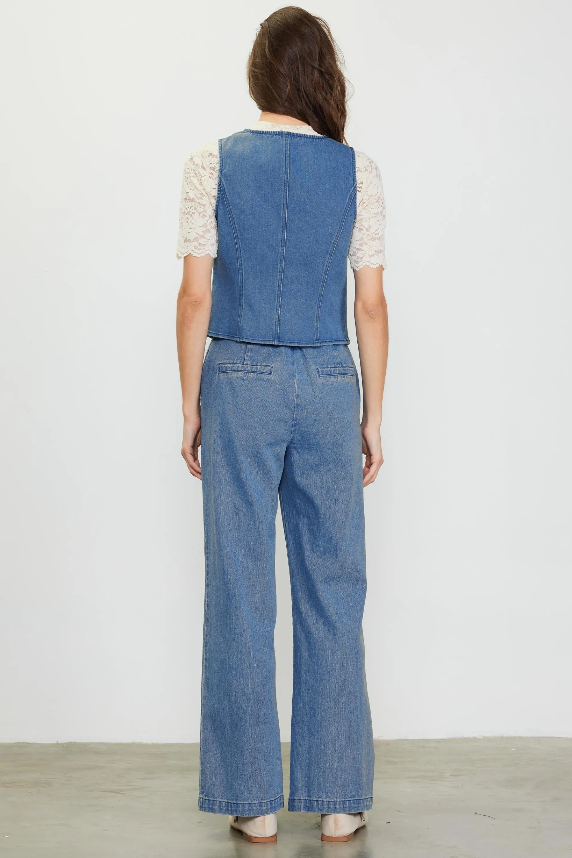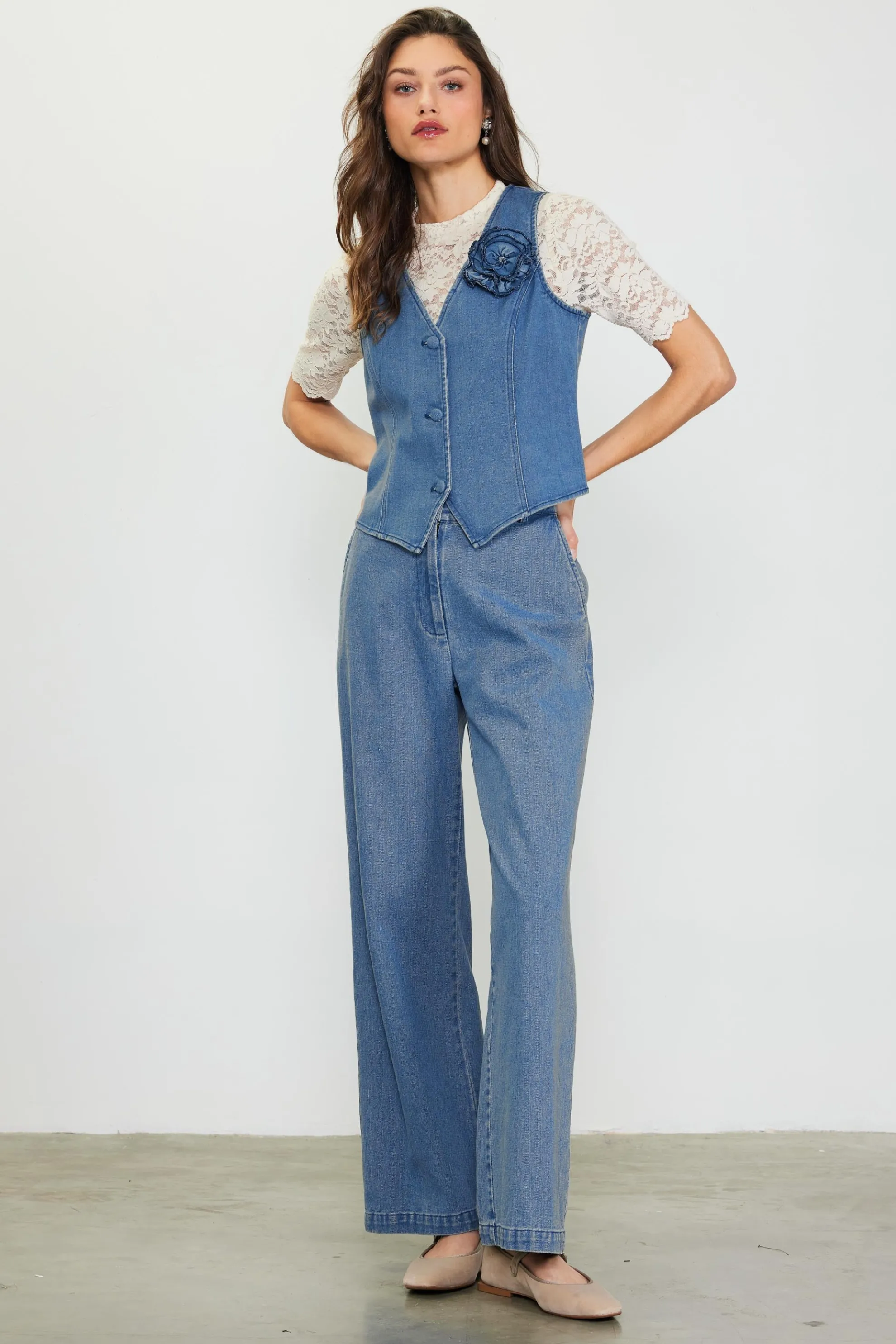 This fitted denim vest offers a cool, casual approach to tailored style. Done in a light blue wash with a bit of fading, it features matching covered buttons and a sweet rosette for a feminine touch.