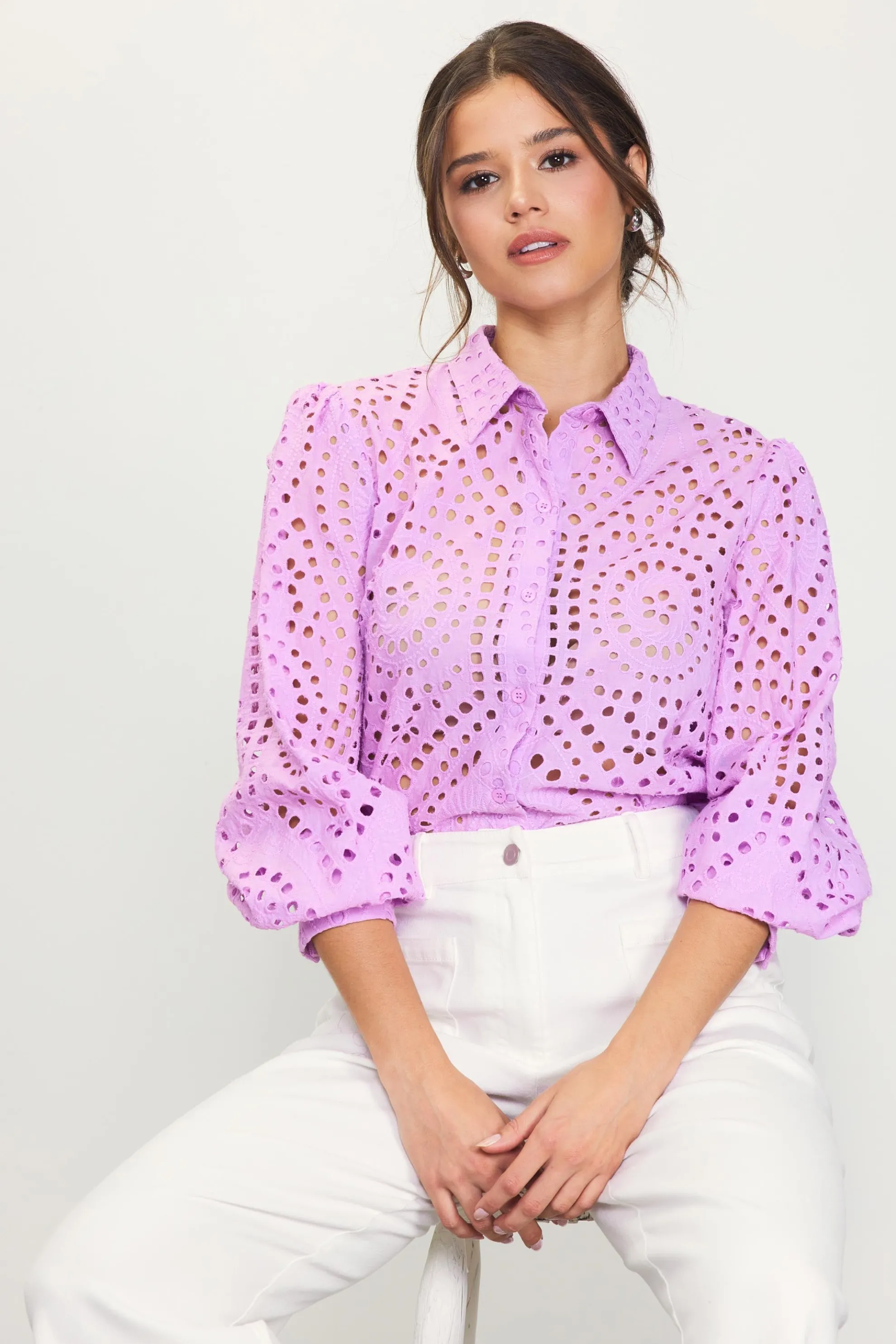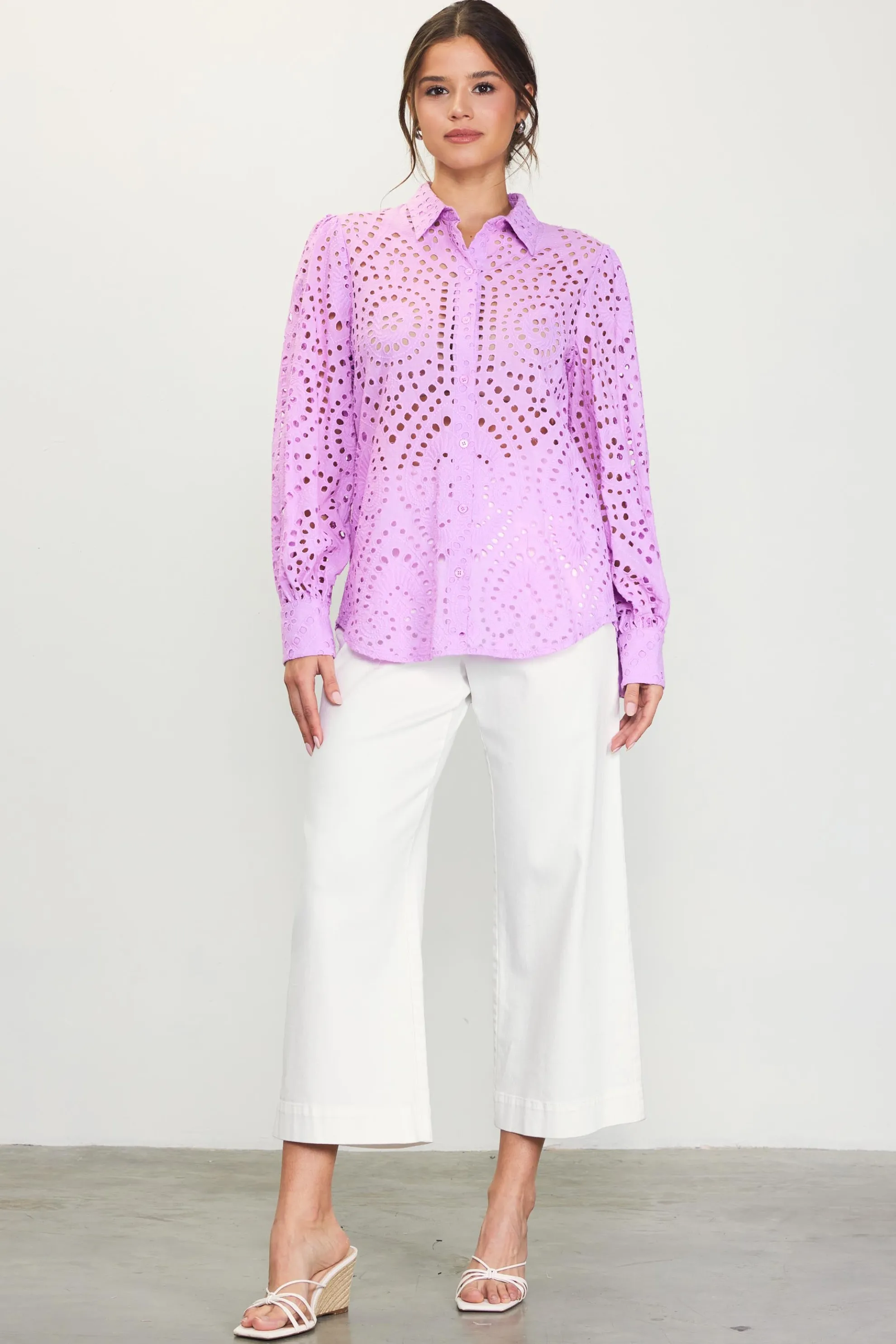 Embroidered eyelets create a peekaboo effect on this airy long-sleeve blouse. Button it up over a tonal cami or layer it on top of your swimwear while on holiday.