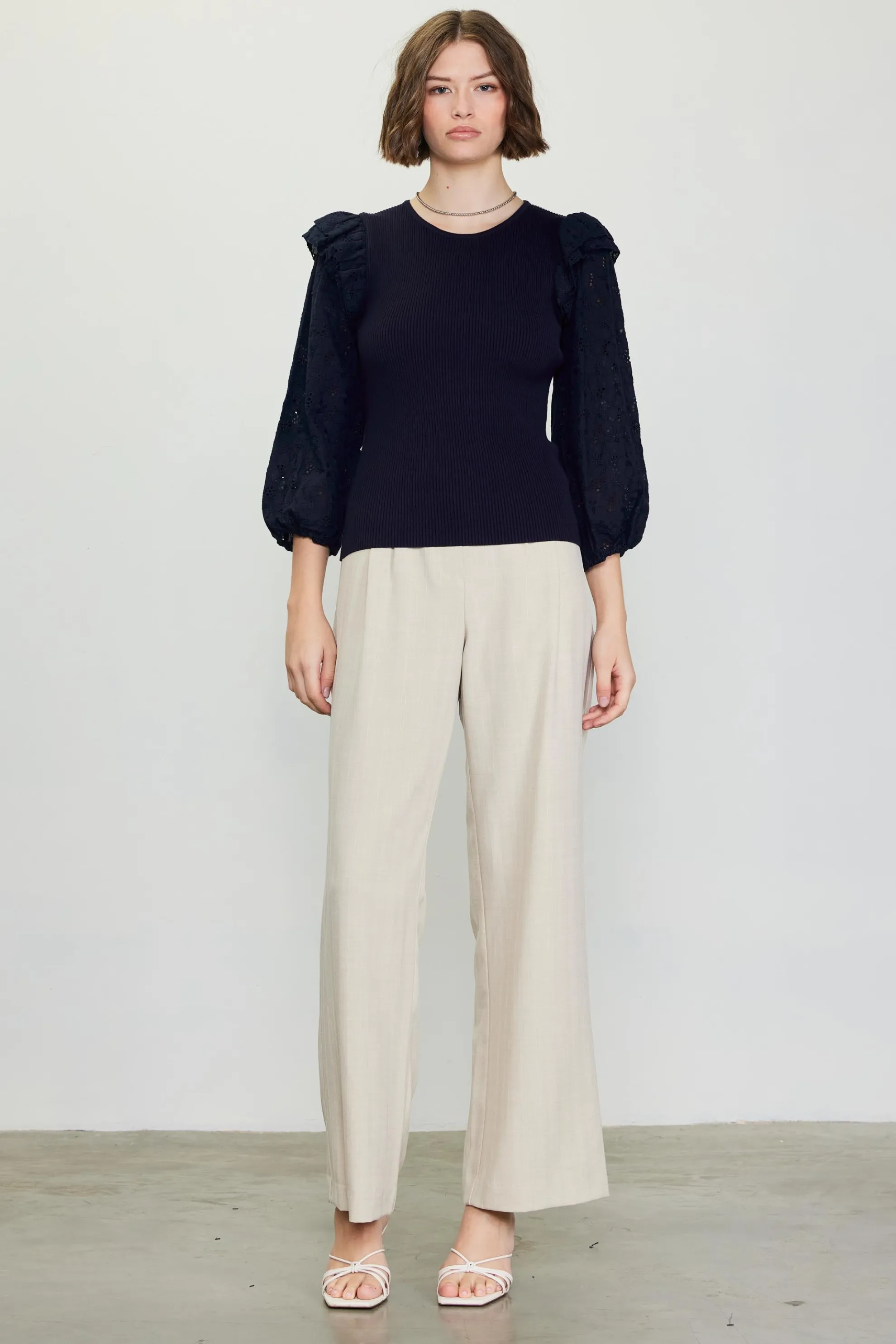 Woven eyelet sleeves frame this scoopneck top made from a comfortable rib knit. Layered ruffles at the shoulders add an extra flourish.
