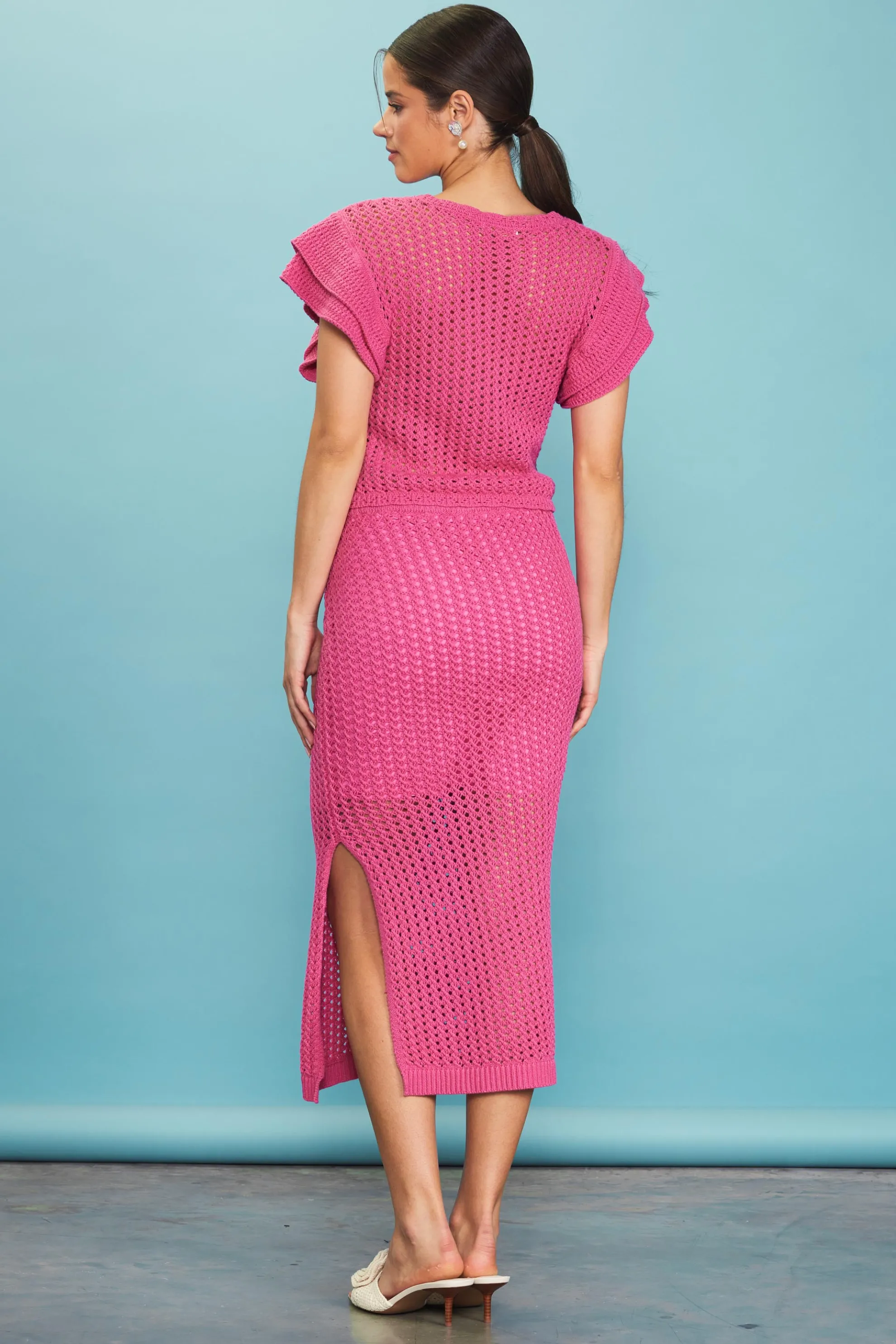 Embrace warmer days in this crochet top with layered flutter sleeves. Bright and fun, it’s got lots of texture and a sunny getaway vibe.