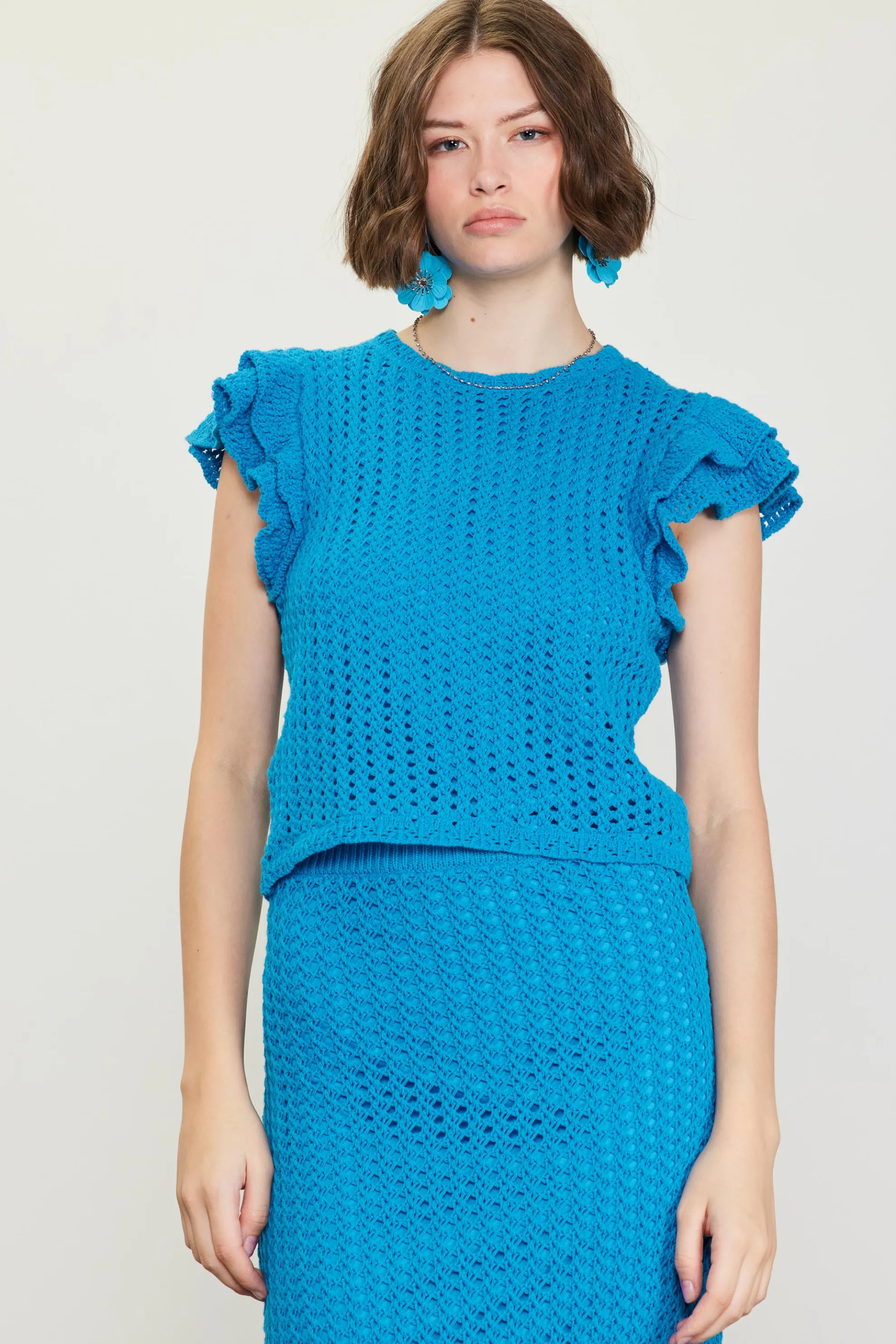 Embrace warmer days in this crochet top with layered flutter sleeves. Bright and fun, it’s got lots of texture and a sunny getaway vibe.