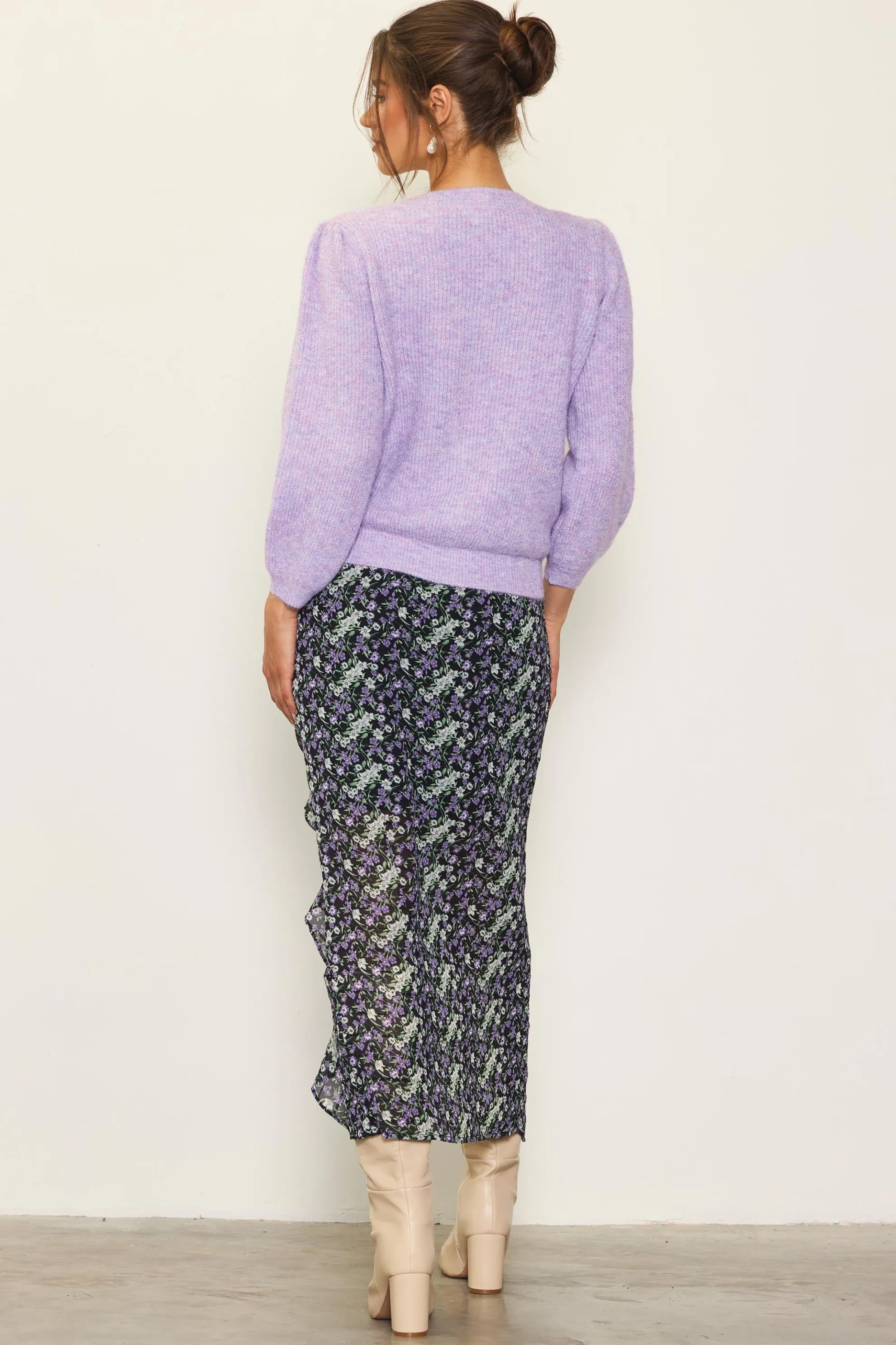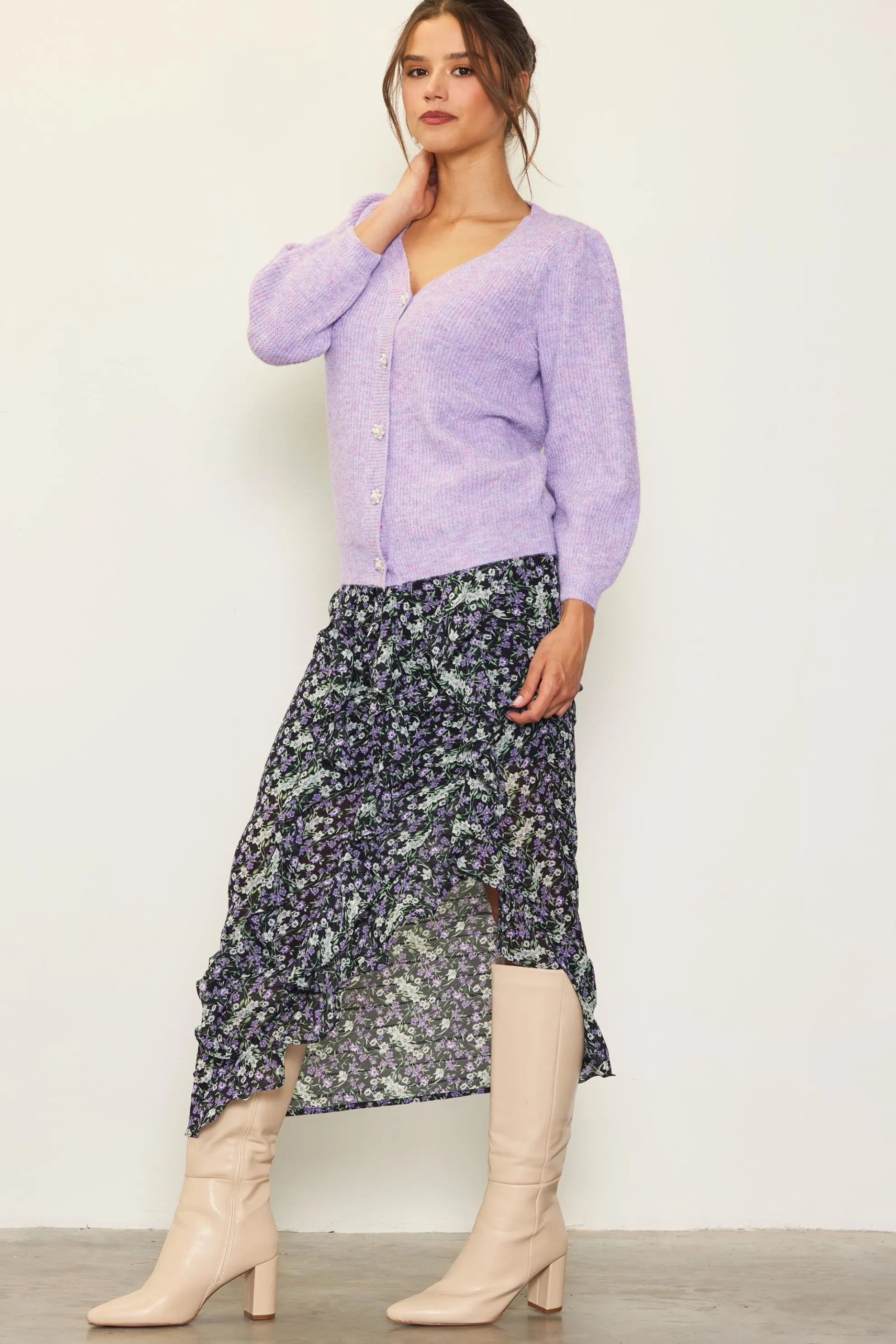 Cozy, but make it sweet. This puff-sleeve cardigan comes in a cushy rib knit shaded with soft color. And let’s not forget about those jewelry-like buttons at the front.