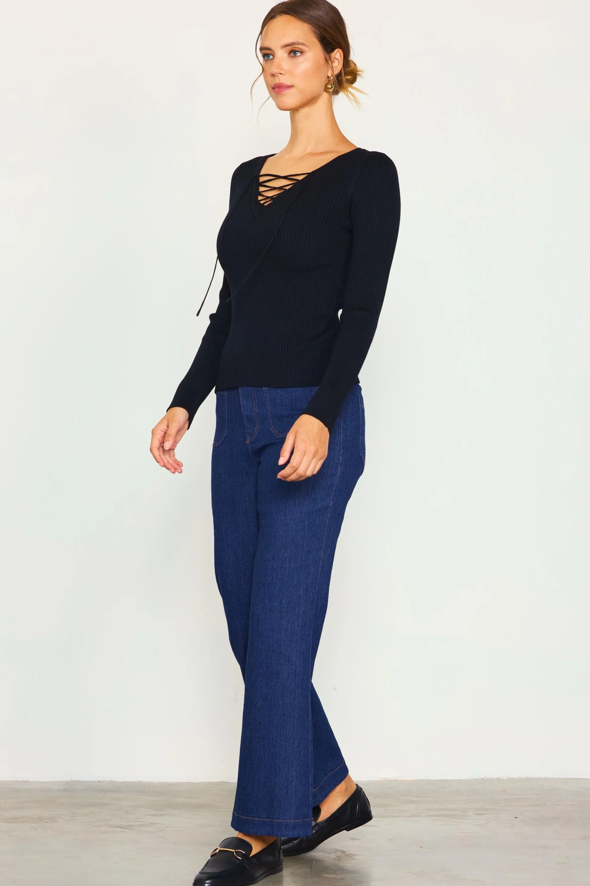 Made from a figure-hugging rib knit, this long-sleeve top has a plunging neckline with lace-up tie detailing that lets you adjust the coverage. Cozy, comfortable, and just the right amount of sexy.