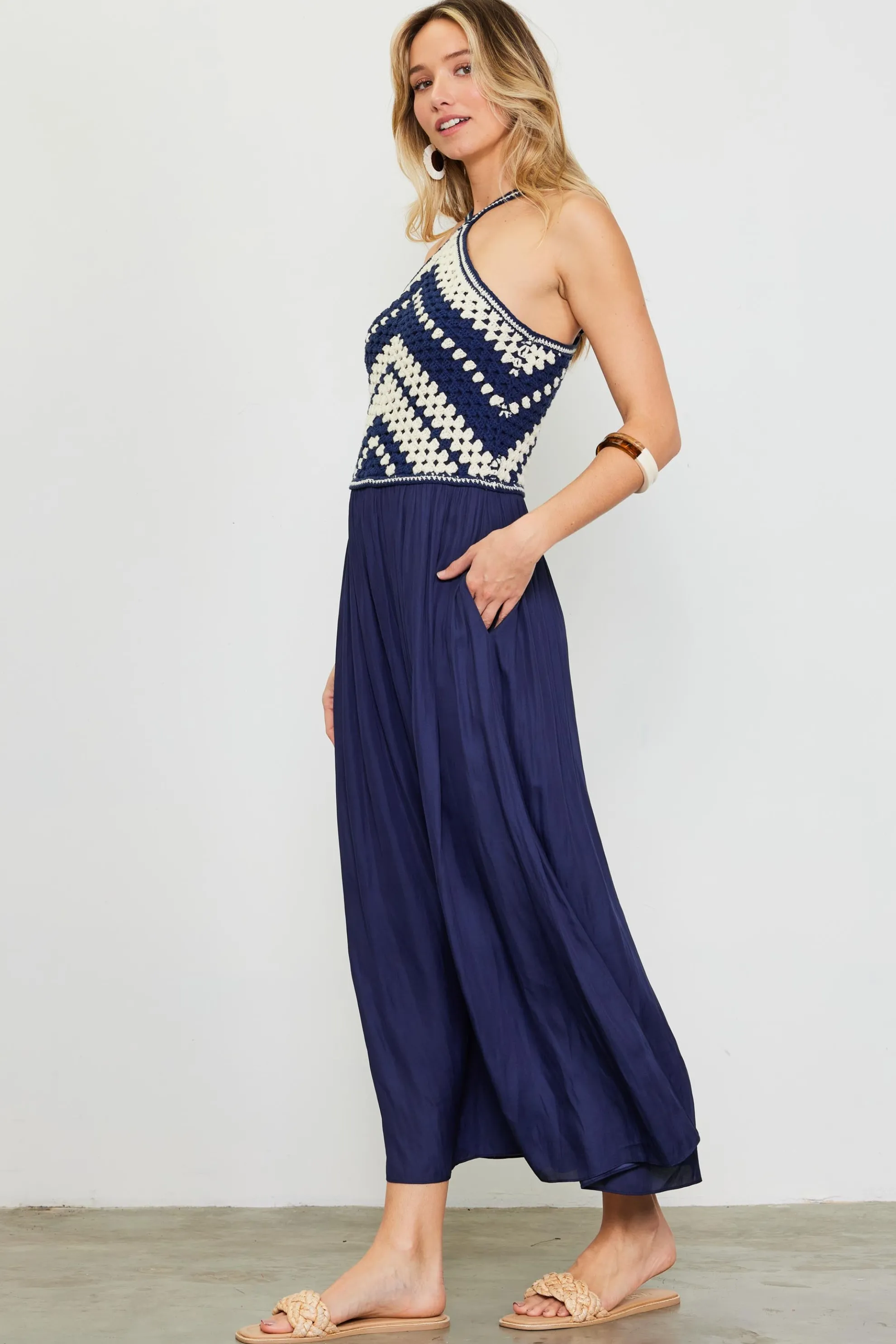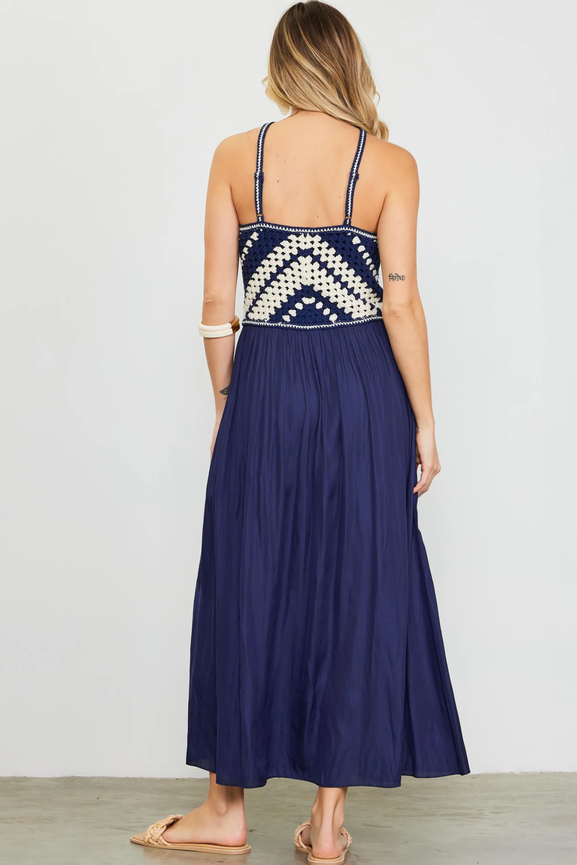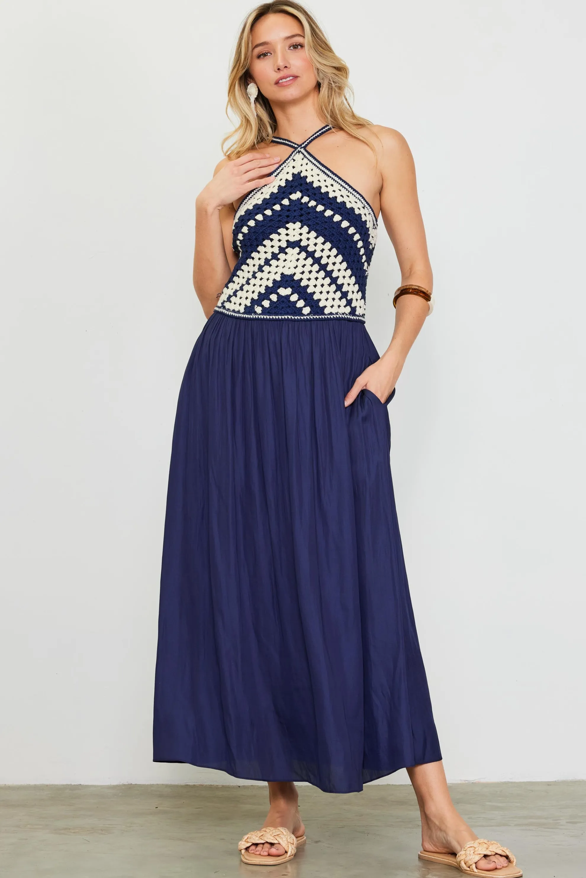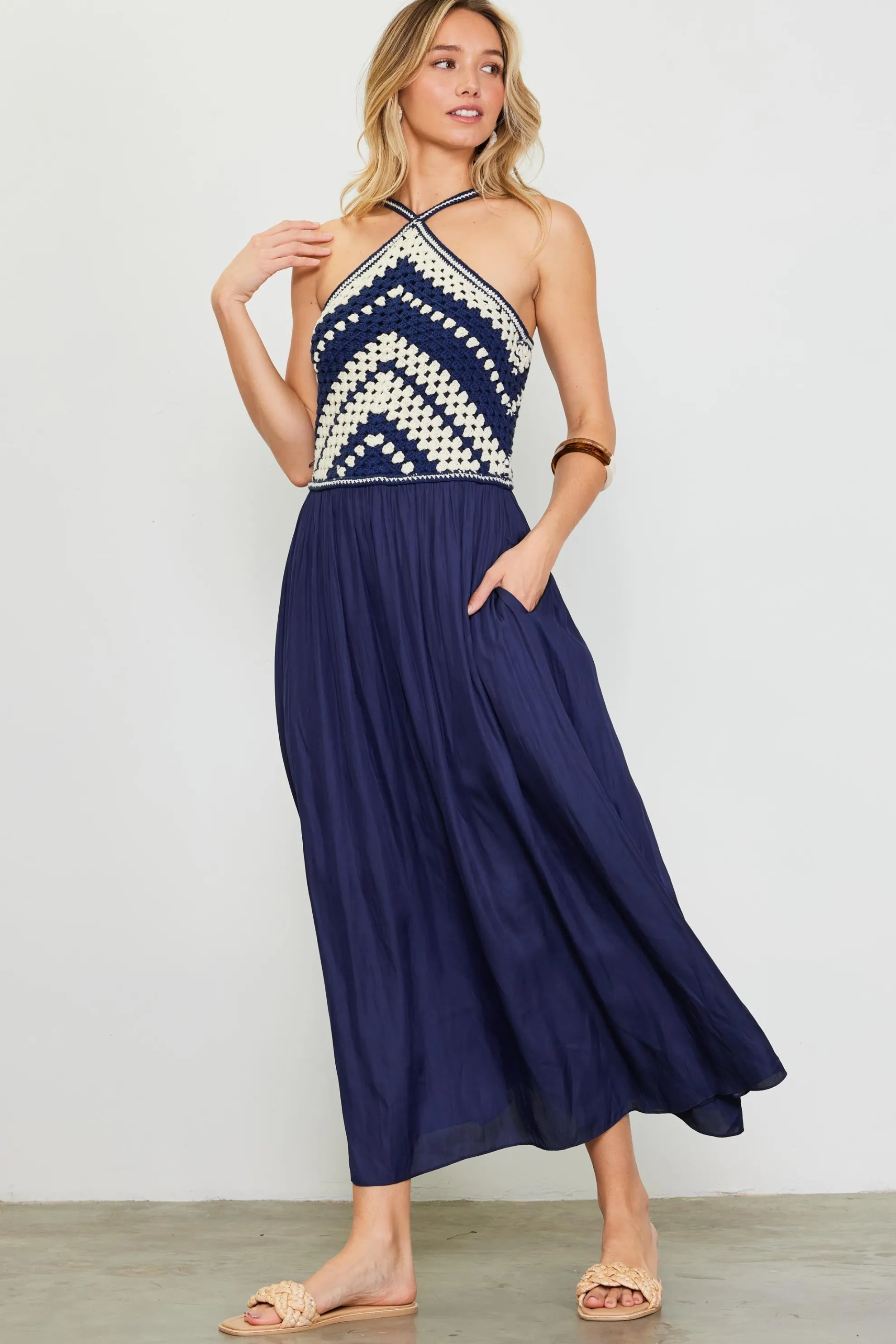 A contrast of fabric textures meets a classic color combination of navy and off-white. Suspended by crisscross straps, this dress features a two-tone crochet halter top balanced by a long, flowy skirt.