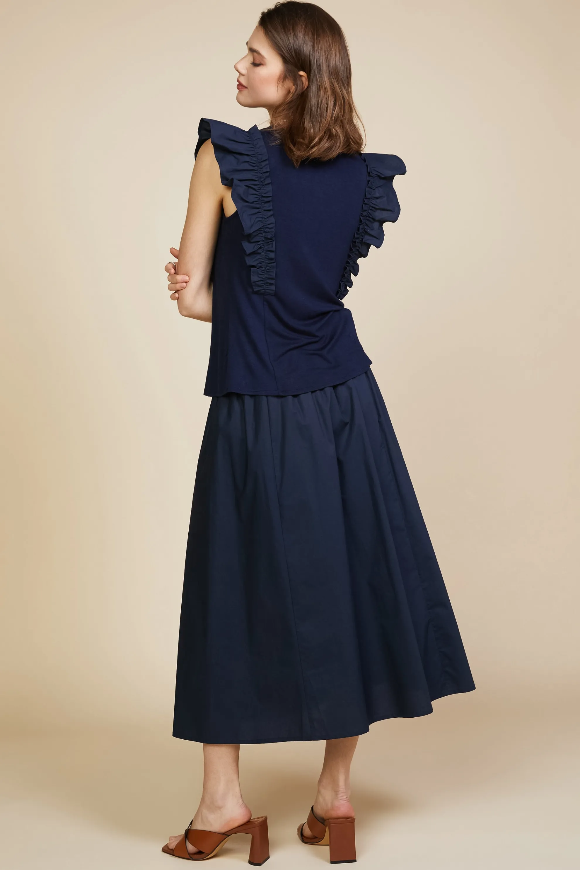 This knit tank has woven ruffle trim that creates a dramatic silhouette. It’s as comfortable as your favorite tee, but more fun and feminine.