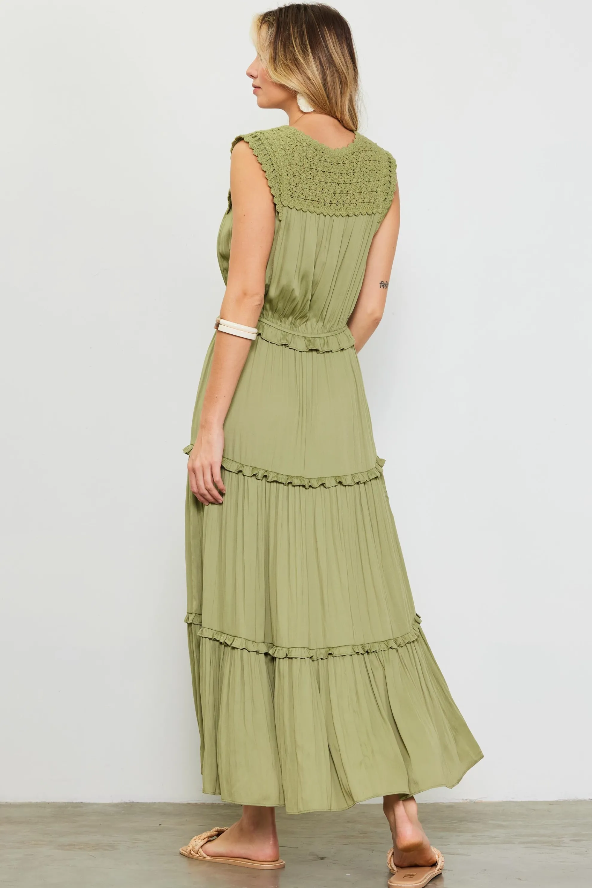 This mixed-media dress will be an effortless addition to your warm-weather lineup. Topped by a tonal knitted toke with scalloped edges, it’s got a relaxed shape that’s cinched in at the waist before flowing to a long, tiered skirt.