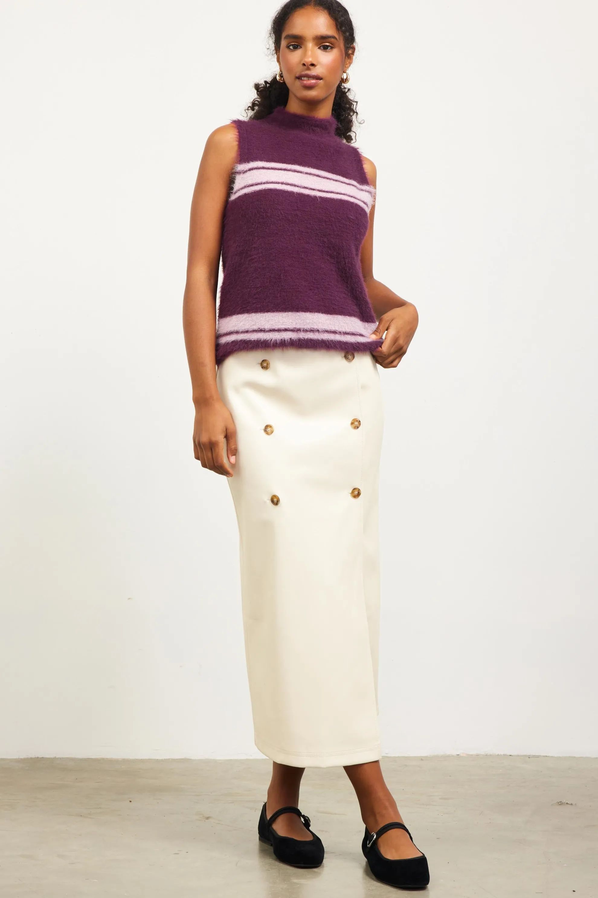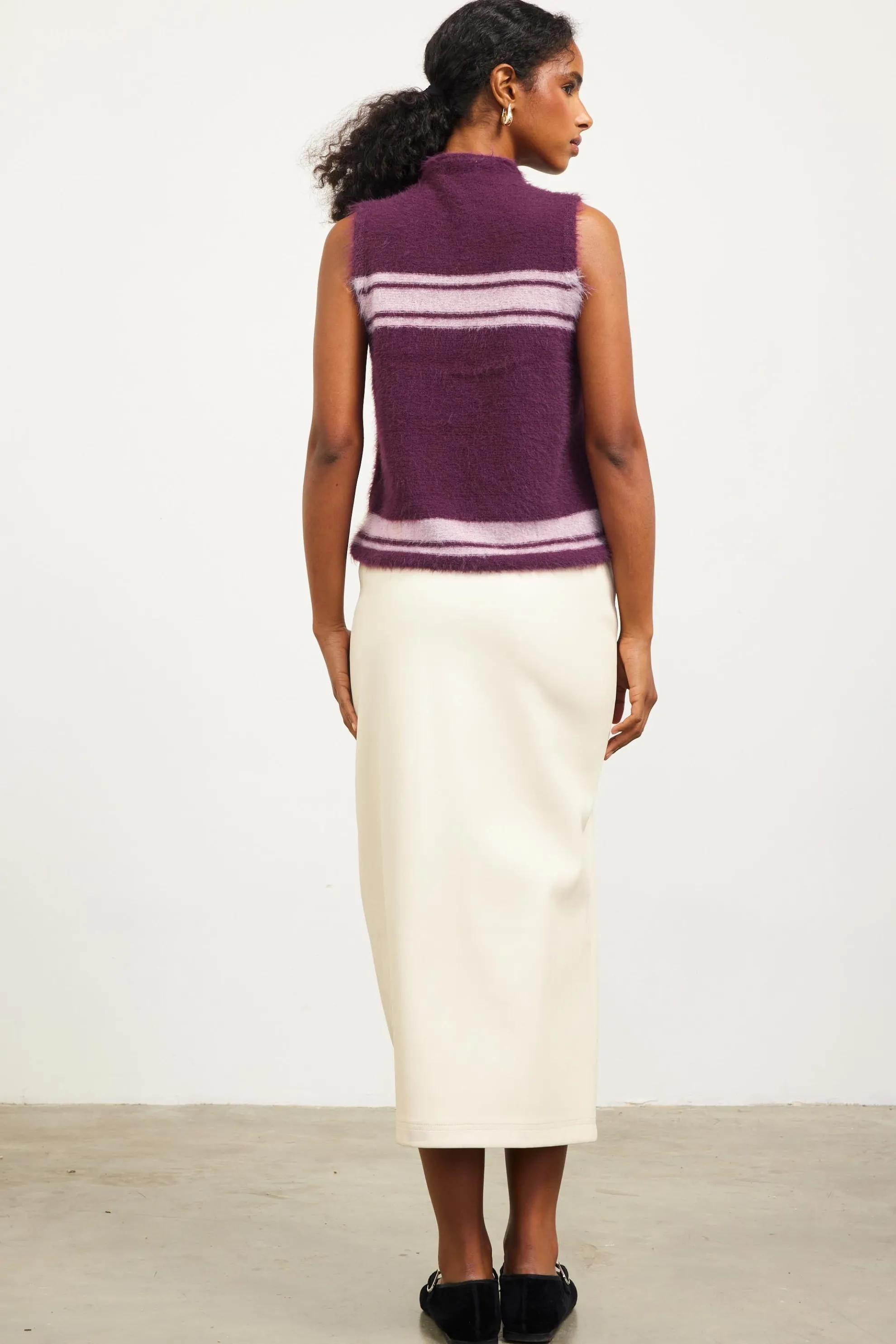 This fuzzy mock-neck top is knitted with stripes across the bust and hem. The silhouette is simple and sleeveless, finished by a little keyhole at the back.