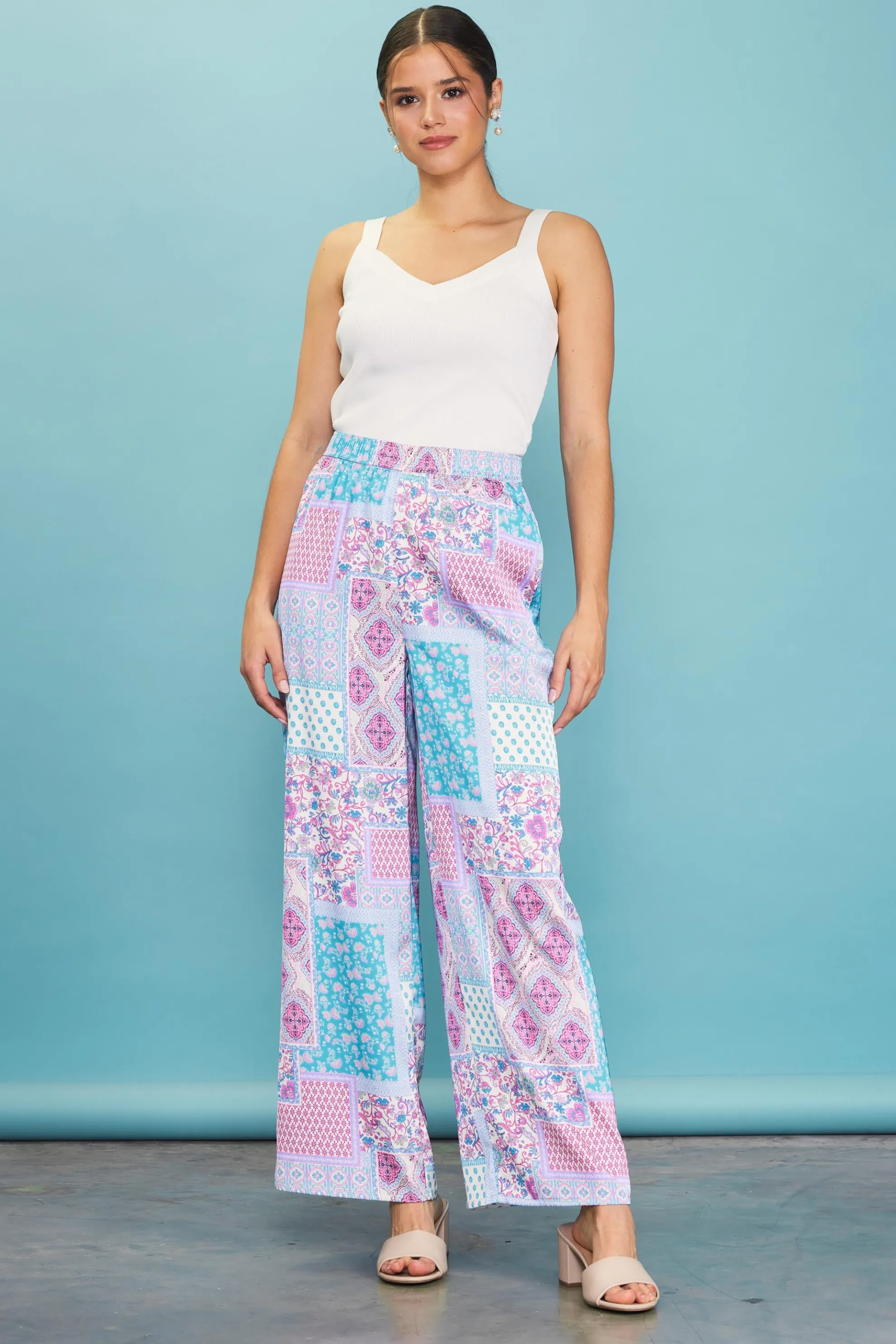 A pair of wide-leg pants evokes a bohemian sensibility in a patchwork print. Topped by an elasticized waistband, the style is loose, relaxed, and easy to wear with its pull-on design.