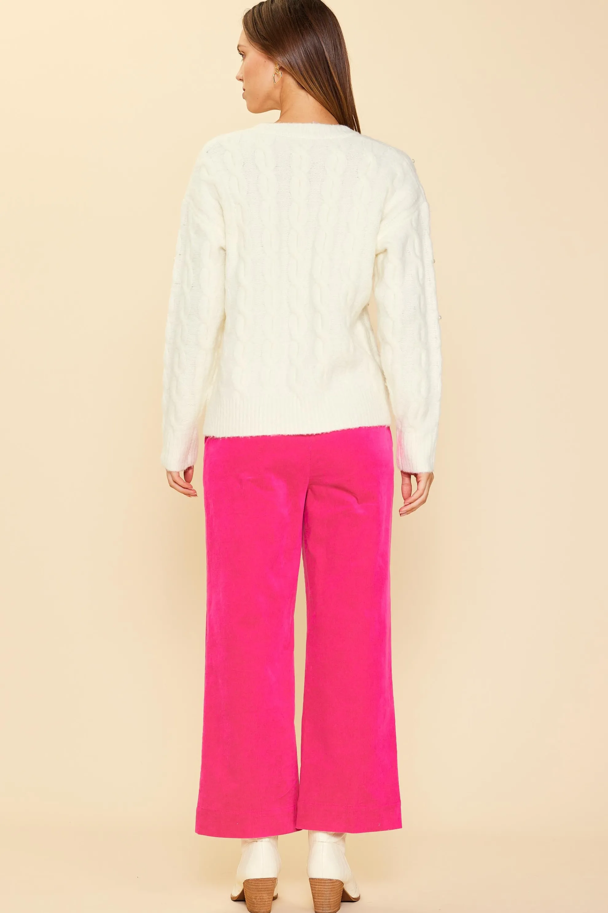 Faux-pearl embellishments dot the cable-knit design of this cozy pullover sweater. It’s a whimsical way to dress up a pair of jeans or pair with a slinky skirt.