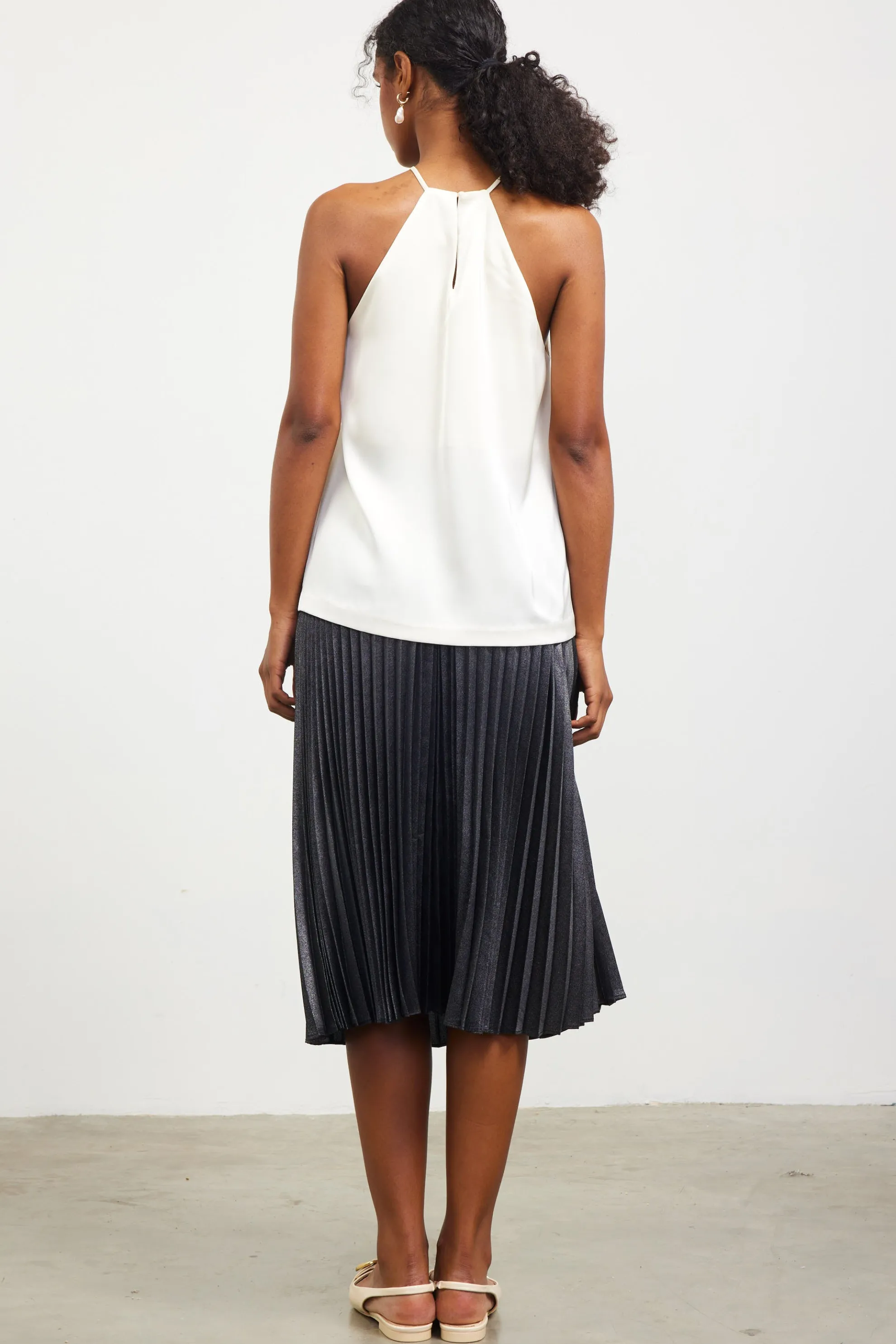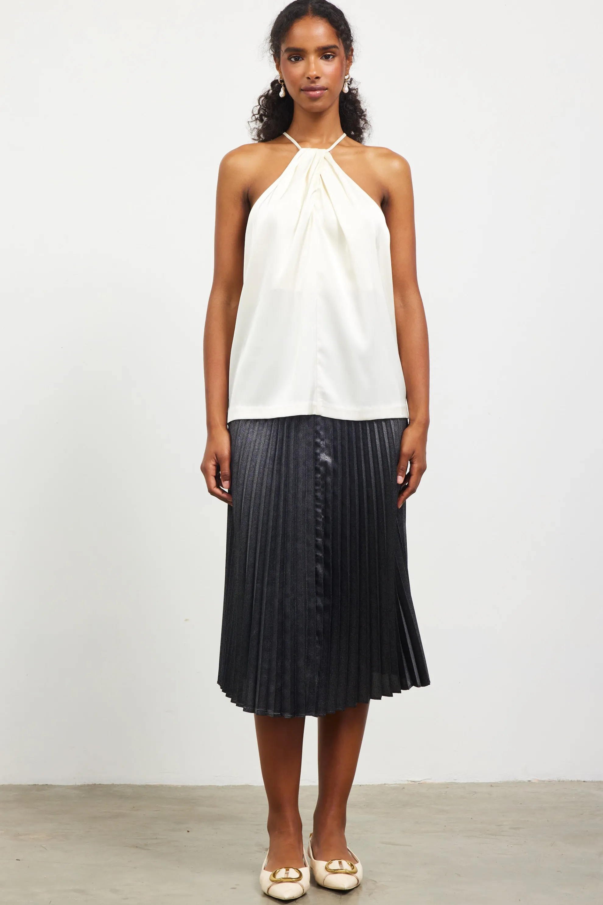 This strappy halter top features elegant pleating detailing at the neckline. The shoulder-baring style floats on air and finishes with a simple back keyhole.