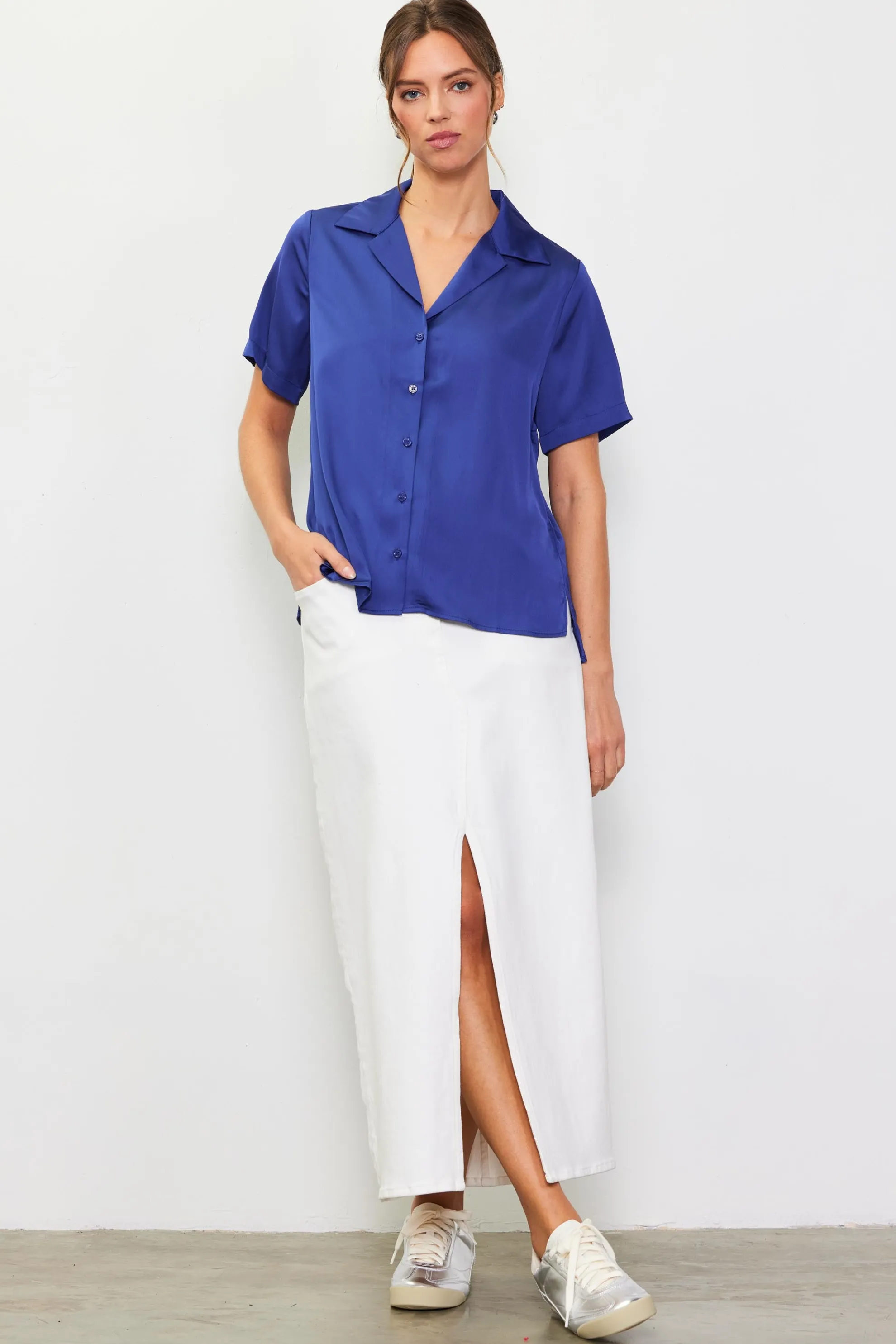 A short-sleeve version of our popular sustainable button-front shirt, this lustrous style is cut from certified recycled materials. It has a relaxed fit with a notched collar, split sides, and a hem that’s slightly longer at the back. Wear it tucked into a pair of jeans or tailored trousers.