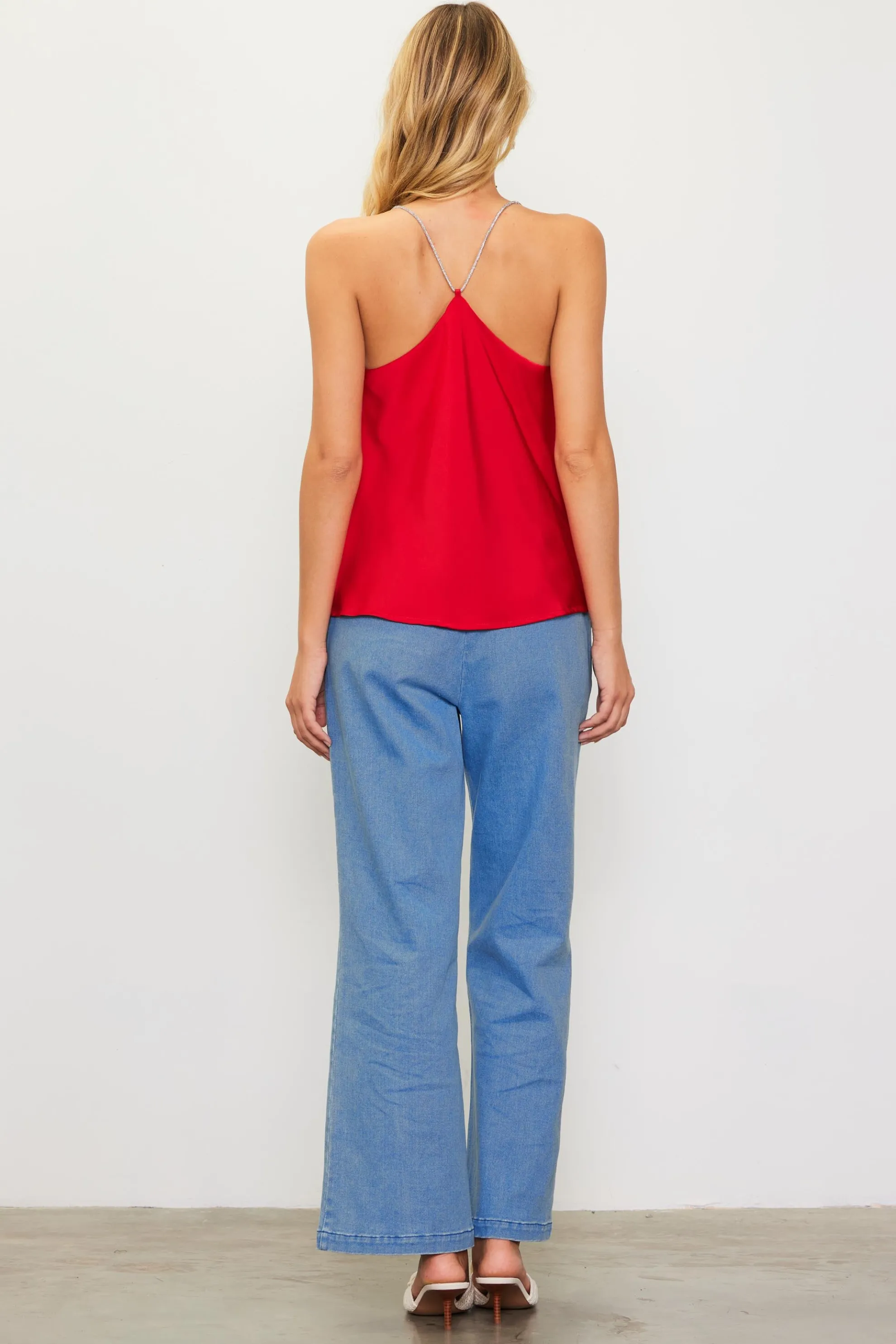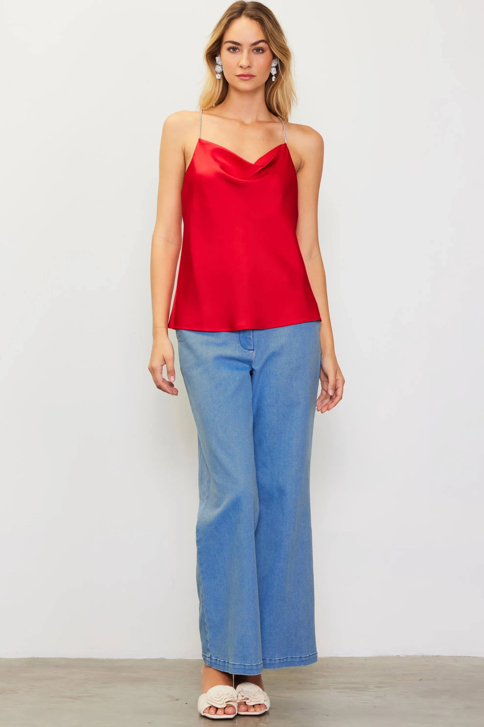 A slinky cami top serves up a bit of twinkle. Accented by embellished spaghetti straps, this occasion-ready number has a draped cowl neckline and a subtle halter-style back. Perfect for your holiday party looks.