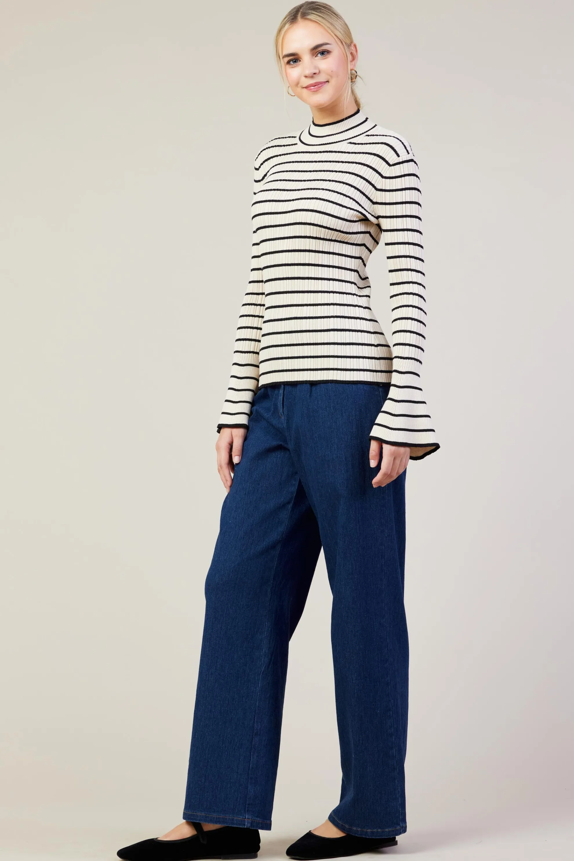 Flared sleeves add just the right amount of drama to this slim-fitting ribbed top. The mock-neck style is knitted with slender stripes in black and cream.