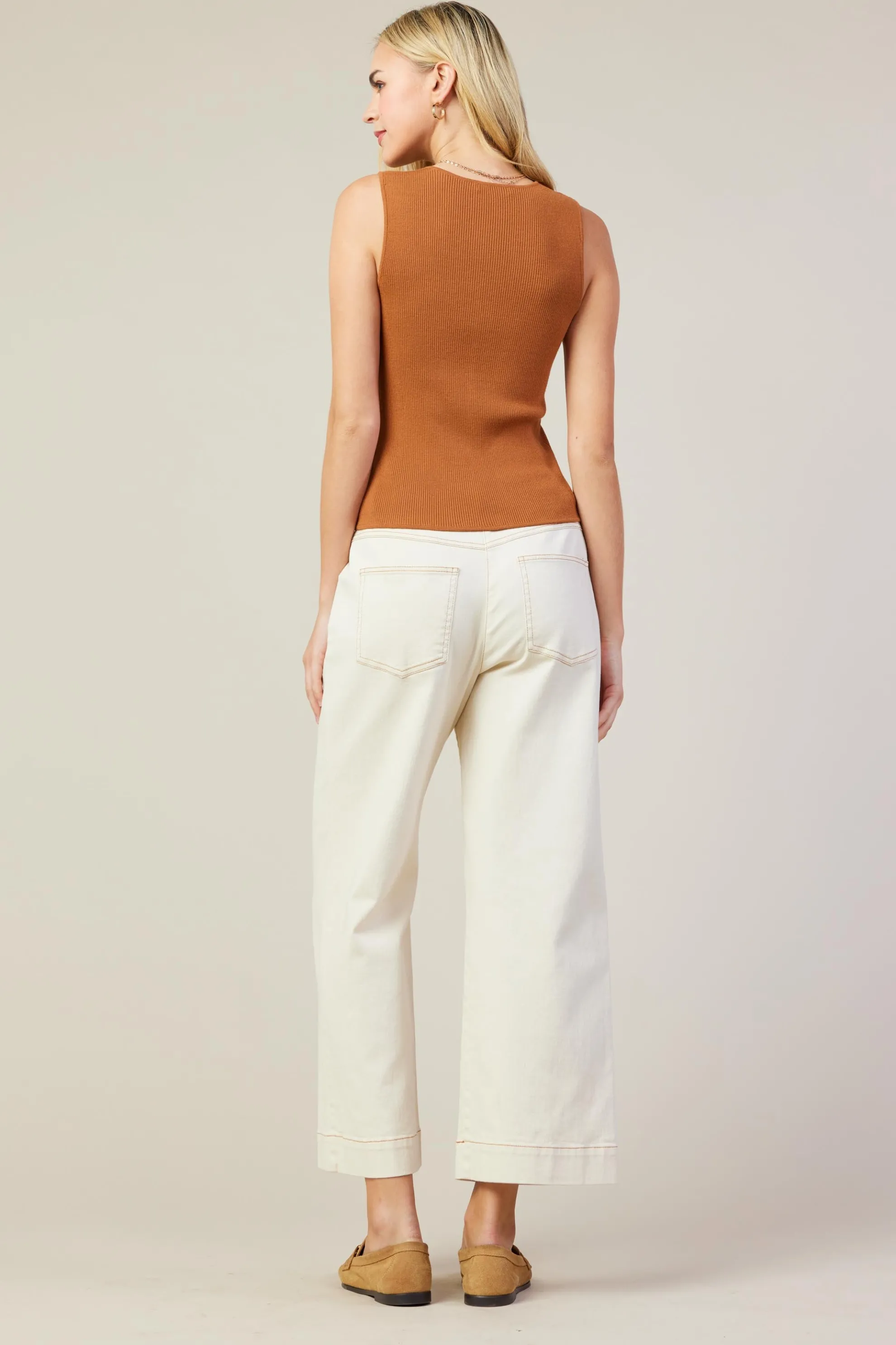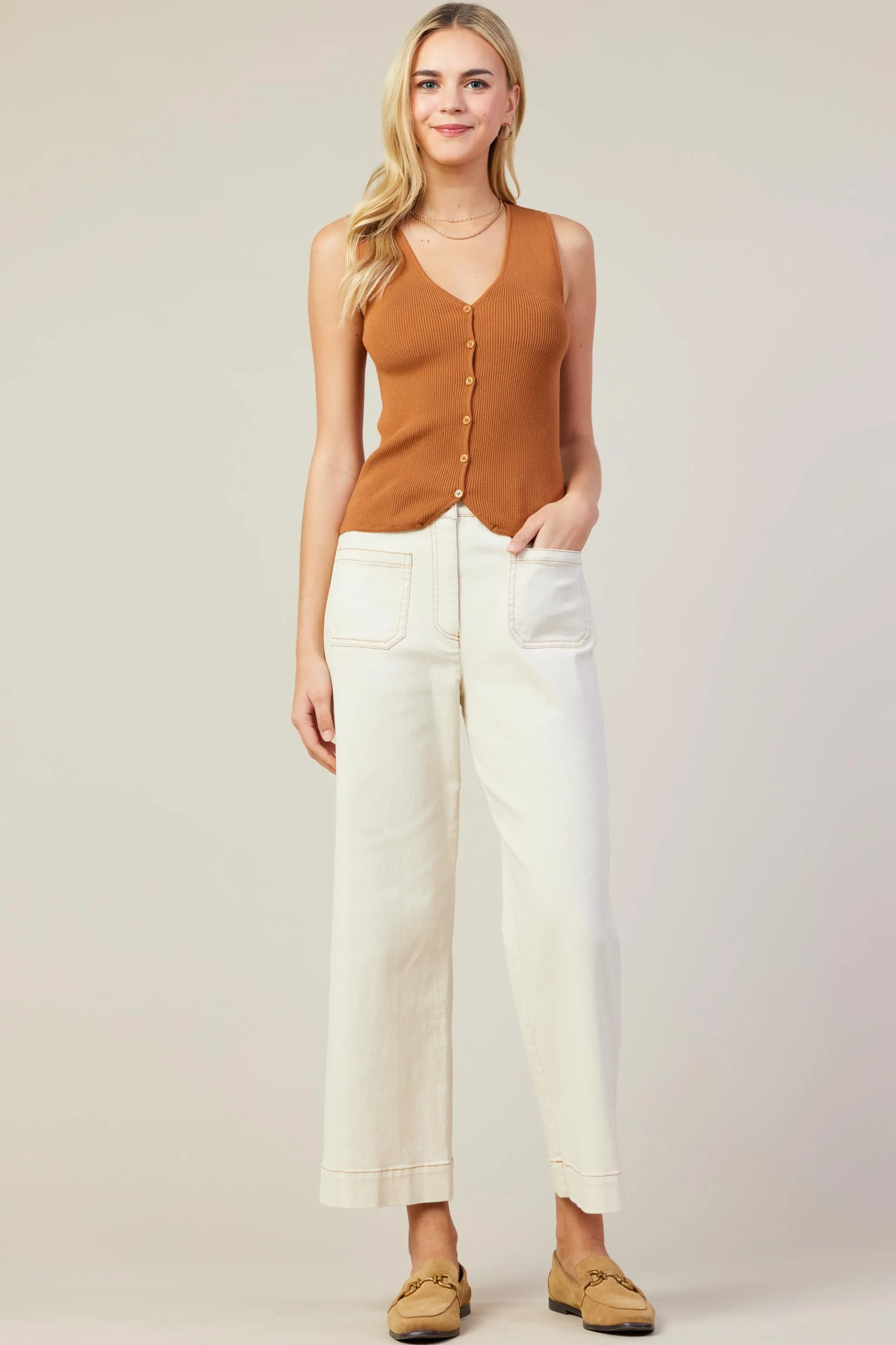 Cut from a clingy ribbed knit, this tank vest is flattering, comfortable, and easy to wear. It’s got a fitted silhouette with a plunging V-shaped neckline and petite buttons at the front.