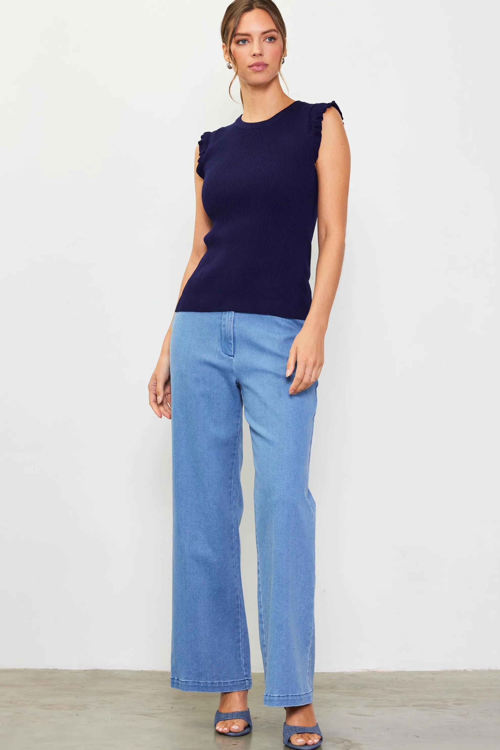 The perfect stand-in for the everyday tee. Made from a comfortable rib knit, this top fits close to the body and features ruffled cap sleeves with pointelle detailing.