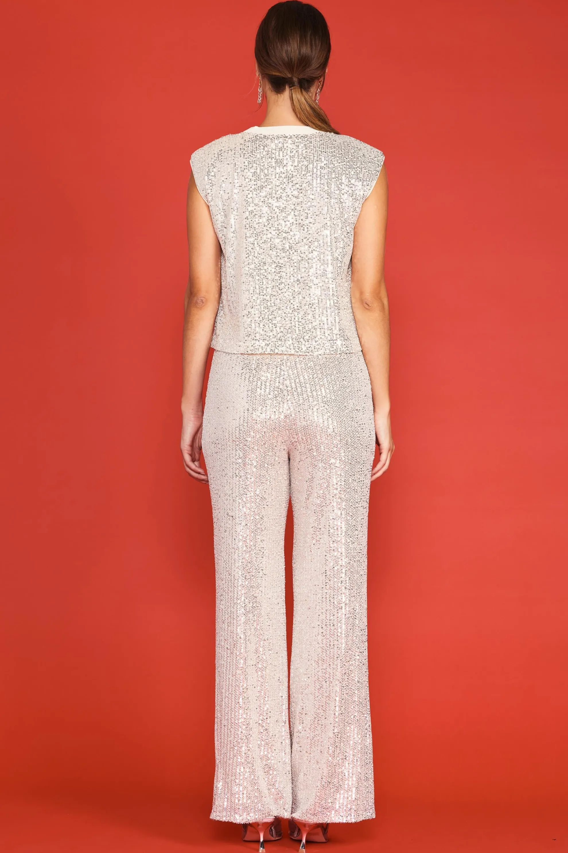 Adorned with thousands of tiny sequins, this boxy muscle top has sparkle aplenty. A ribbed neckline and structured shoulders define the shape.