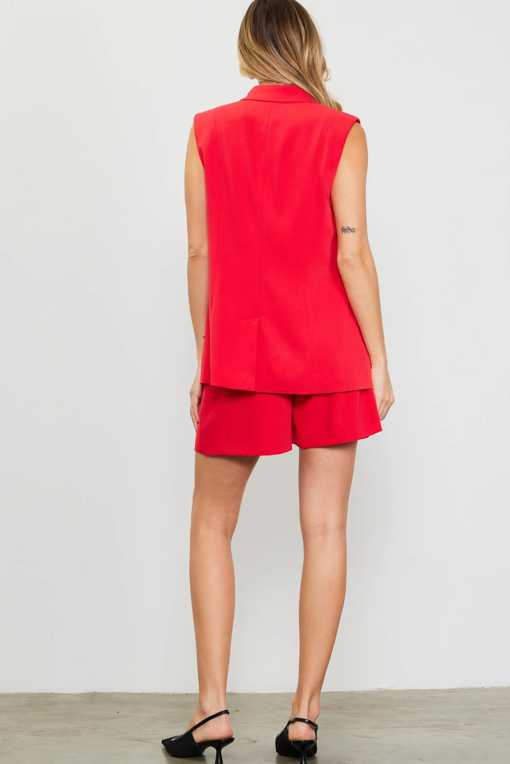 Menswear-inspired tailoring gets refreshed for the warmer months. This sleeveless blazer adds a sharp, pulled-together element to any look. Structured at the shoulders, it’s got notched lapels, tonal buttons, and flap pockets. A vented back hem eases the fit. Wear it as a set with the matching pleated shorts.