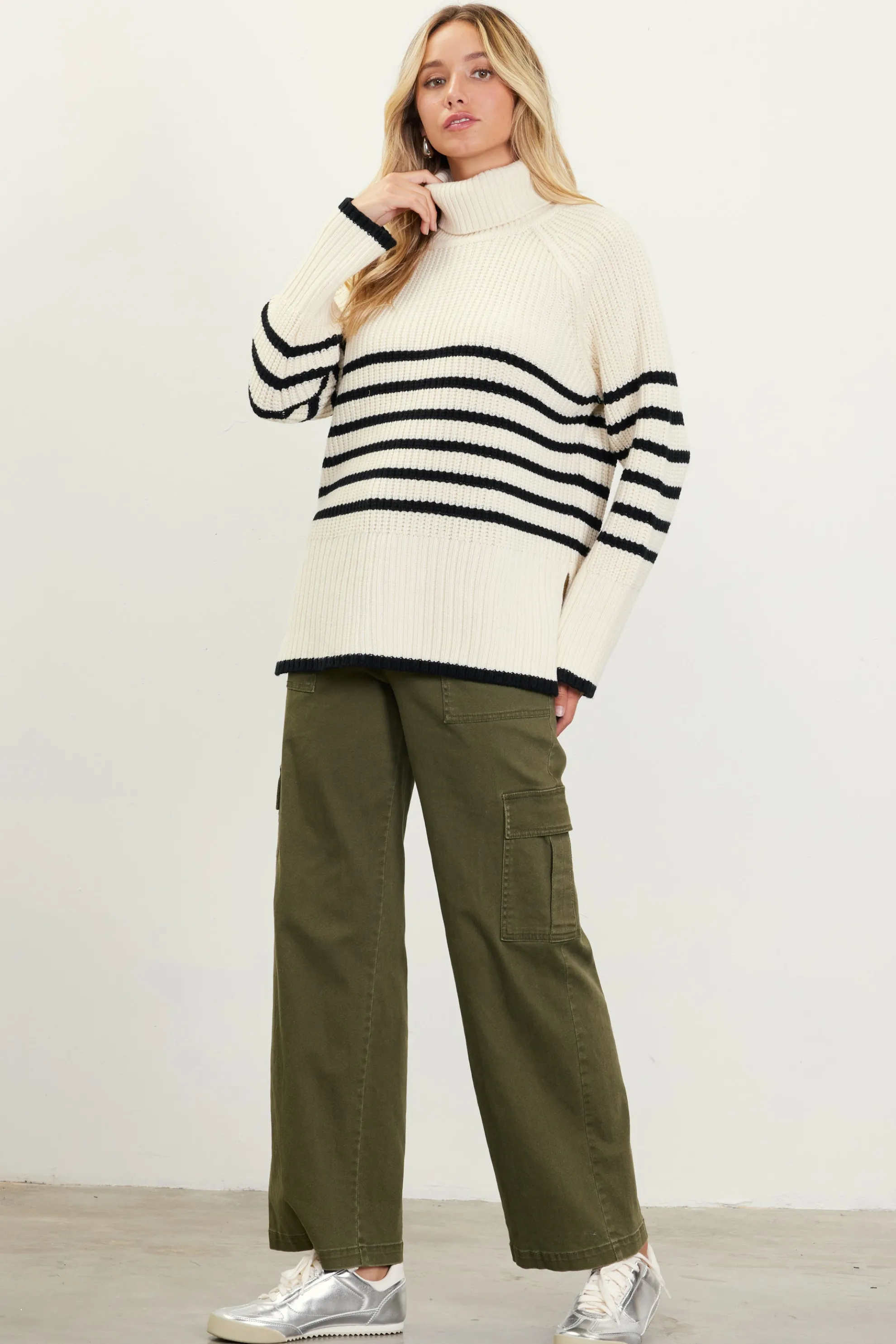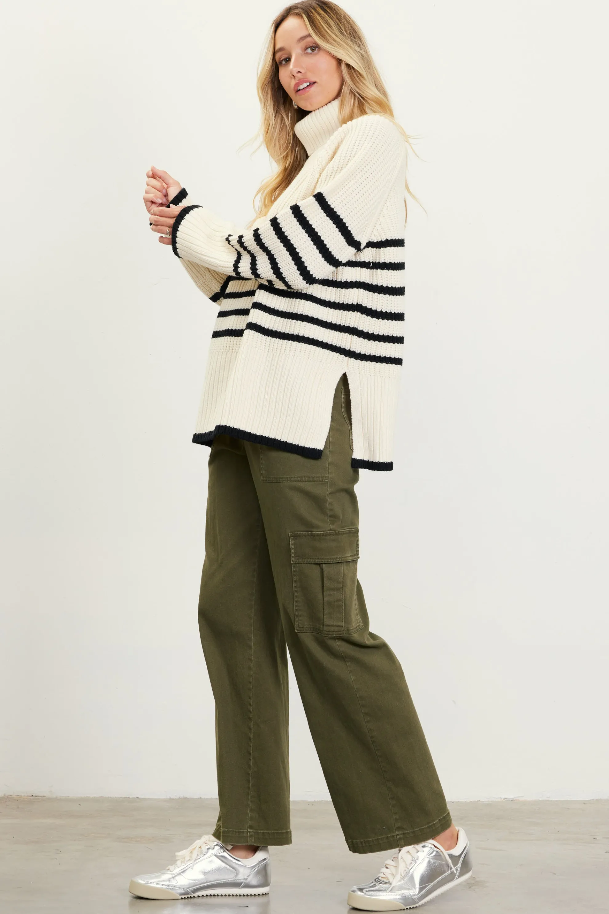 Stay warm and cozy in this oversized turtleneck sweater. With a playful striped design, this sweater is the perfect addition to your winter wardrobe. Stay stylish and warm all season long.