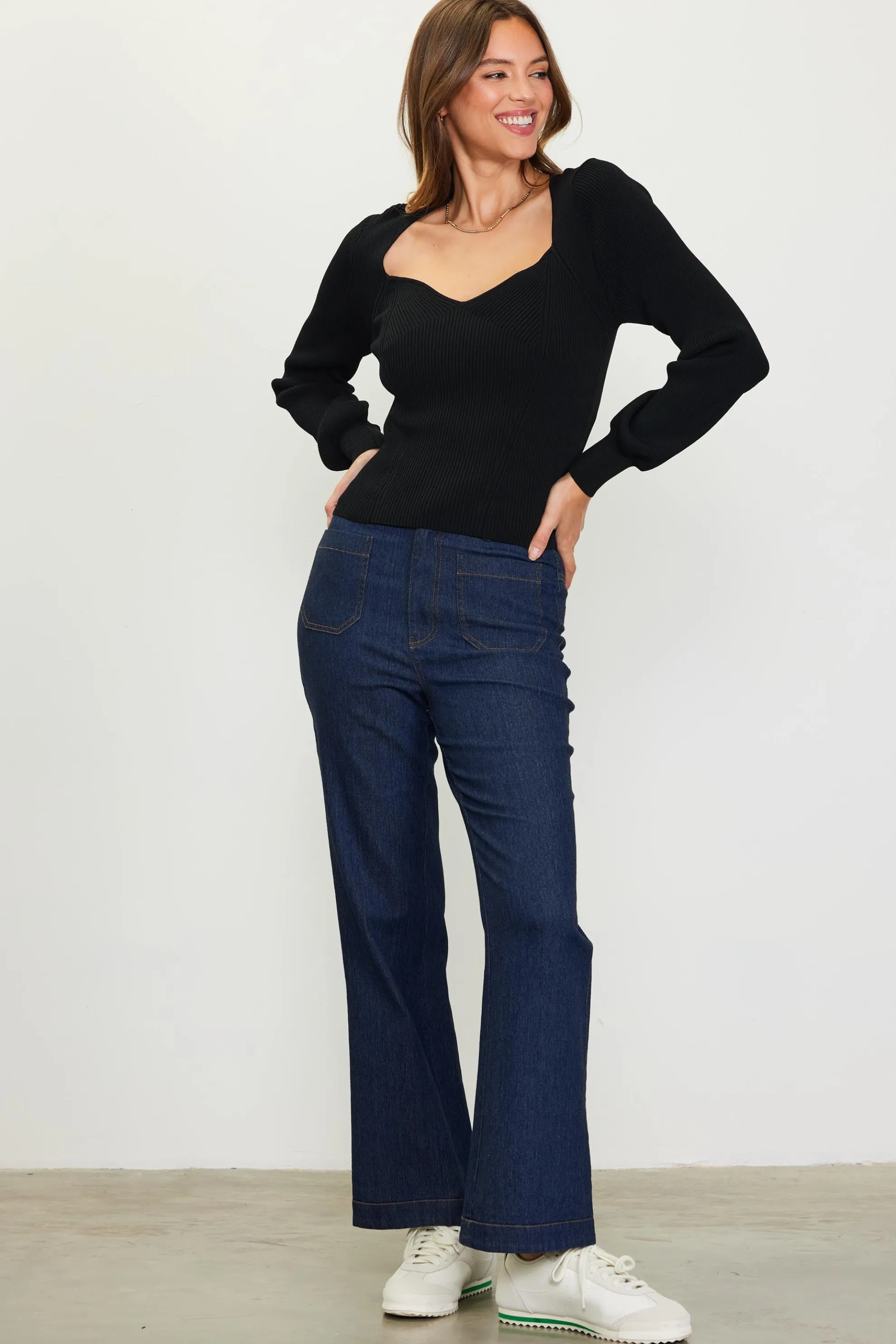 Alluring and ultra-feminine in a curve-hugging rib knit, this fitted top has a sweetheart neckline and bishop sleeves. Wear yours with jeans or a slinky skirt.