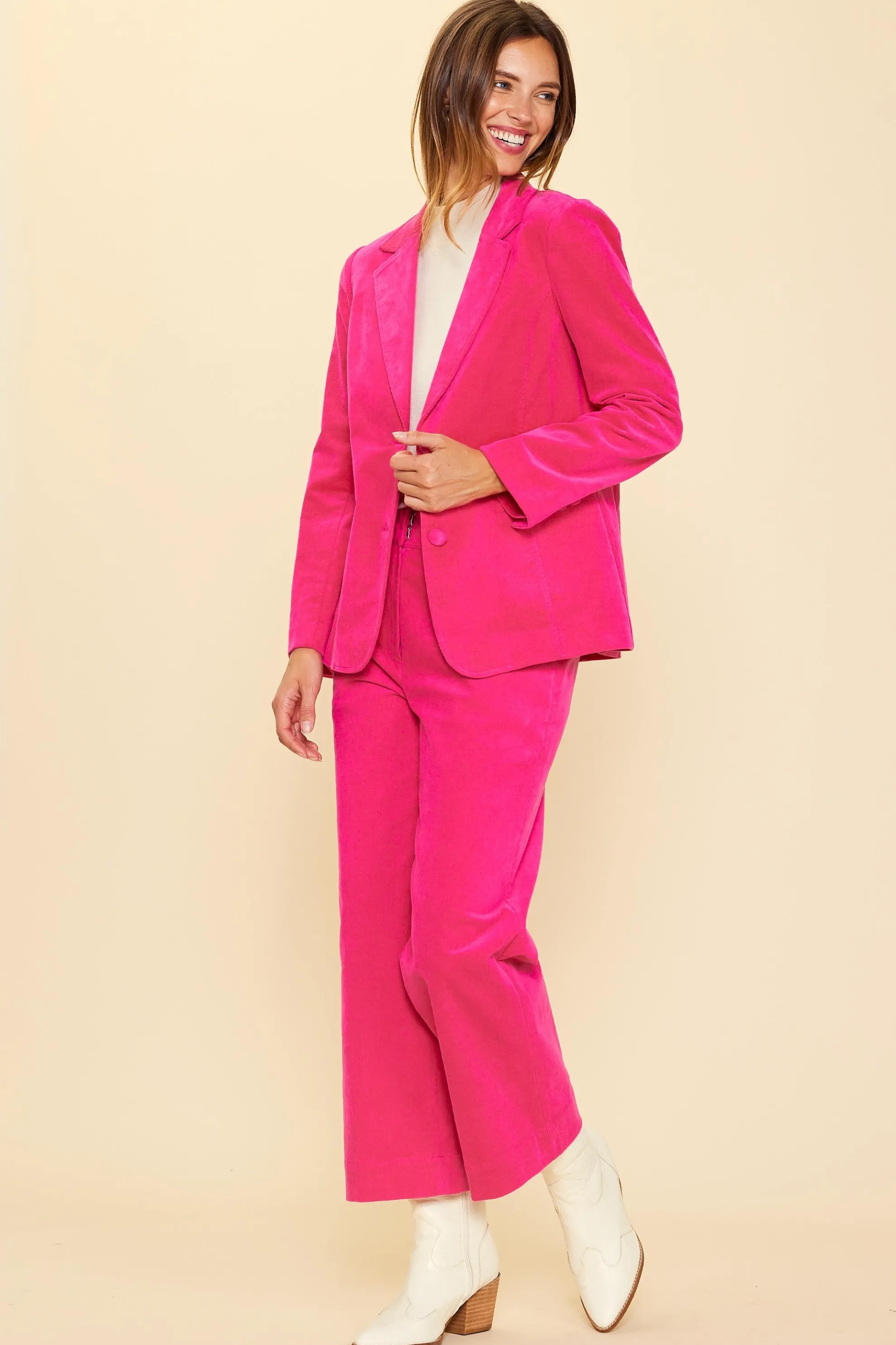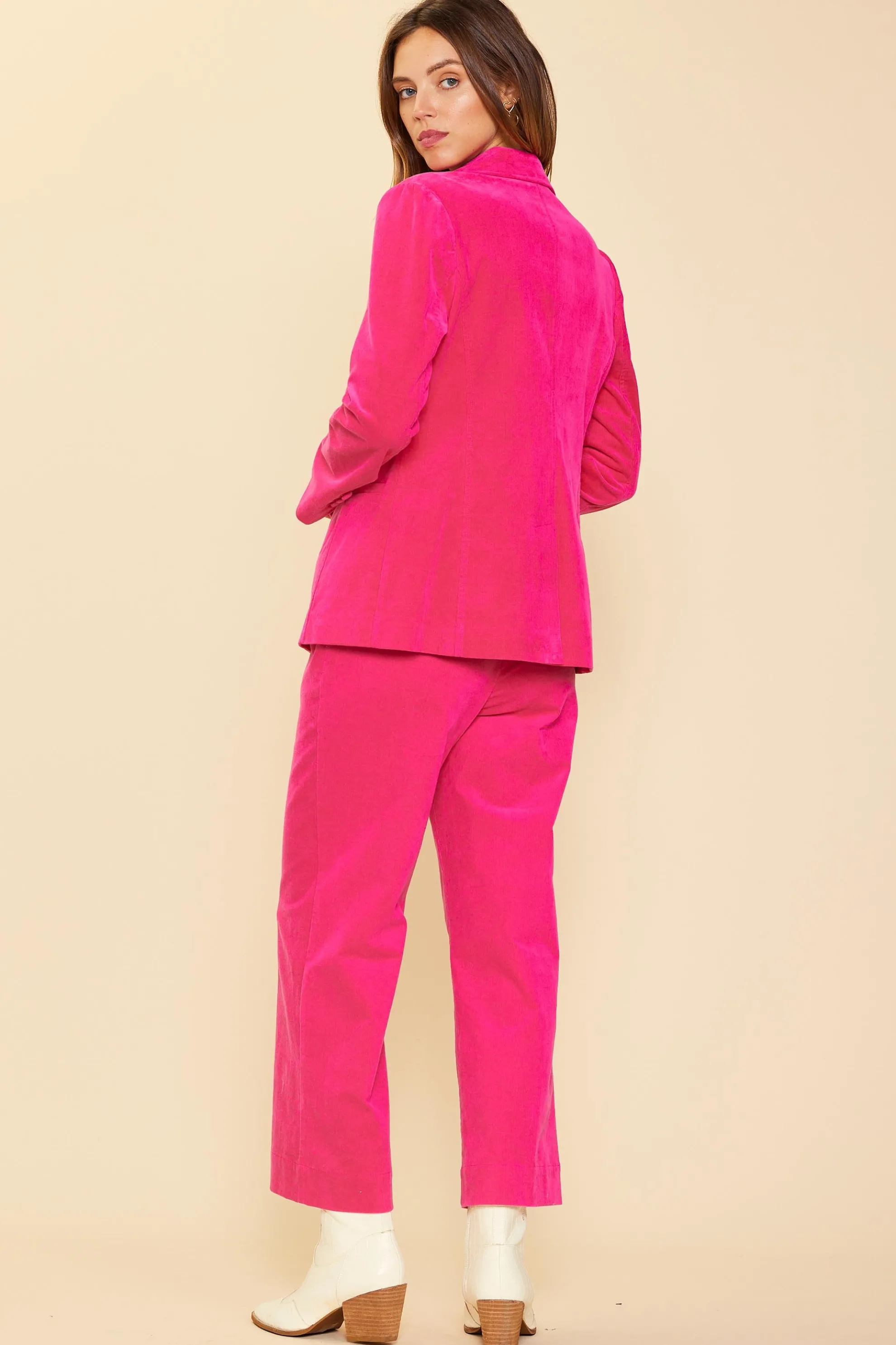Between the bright-pink shade and the velvety-soft texture, this fine-wale corduroy blazer offers a fun take on tailored style. The details are timeless—notched lapels, welt pockets, and covered buttons, plus a vented back hem to ease the fit. Pair it with our matching wide-leg pants for a bold statement.