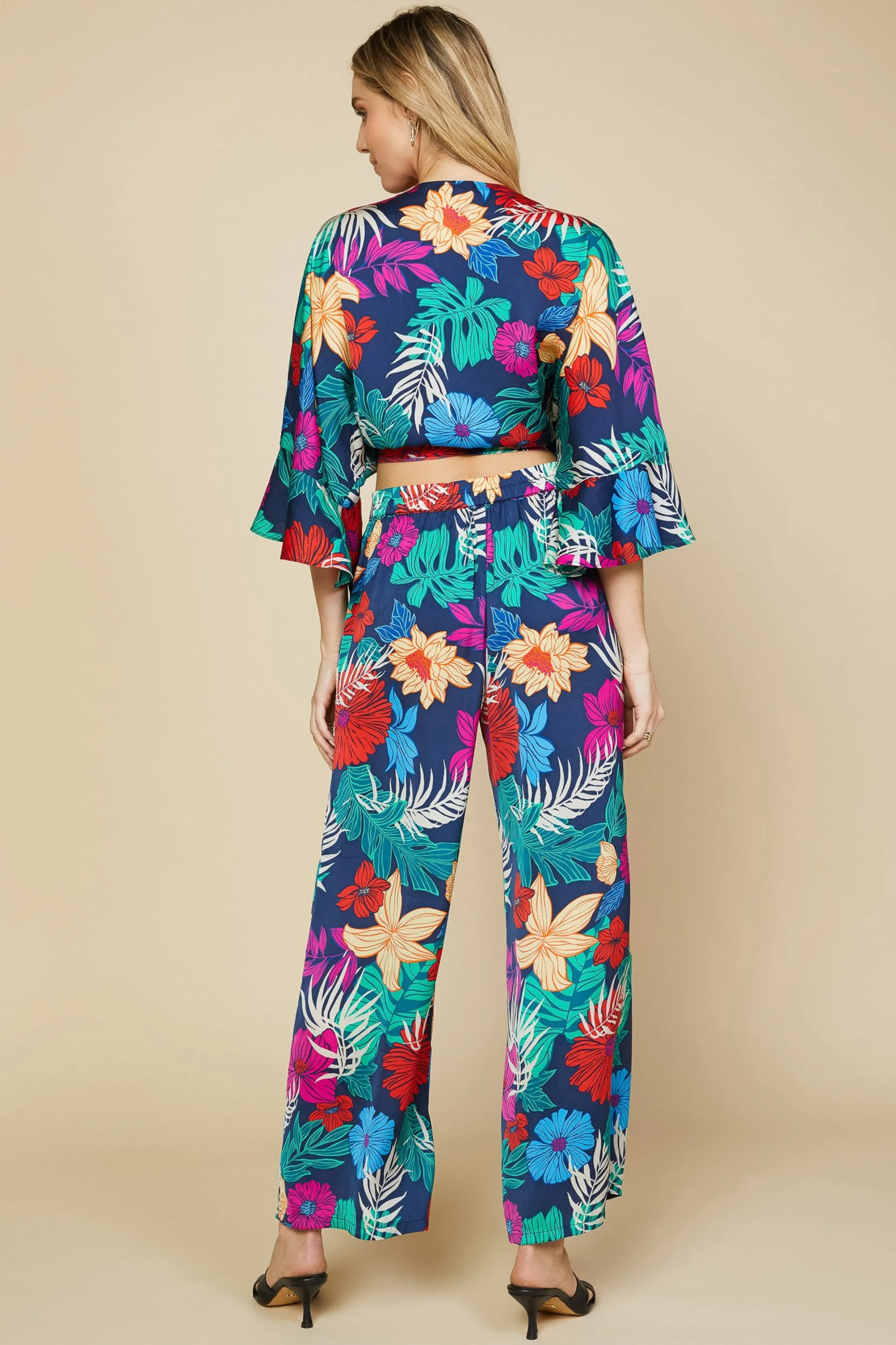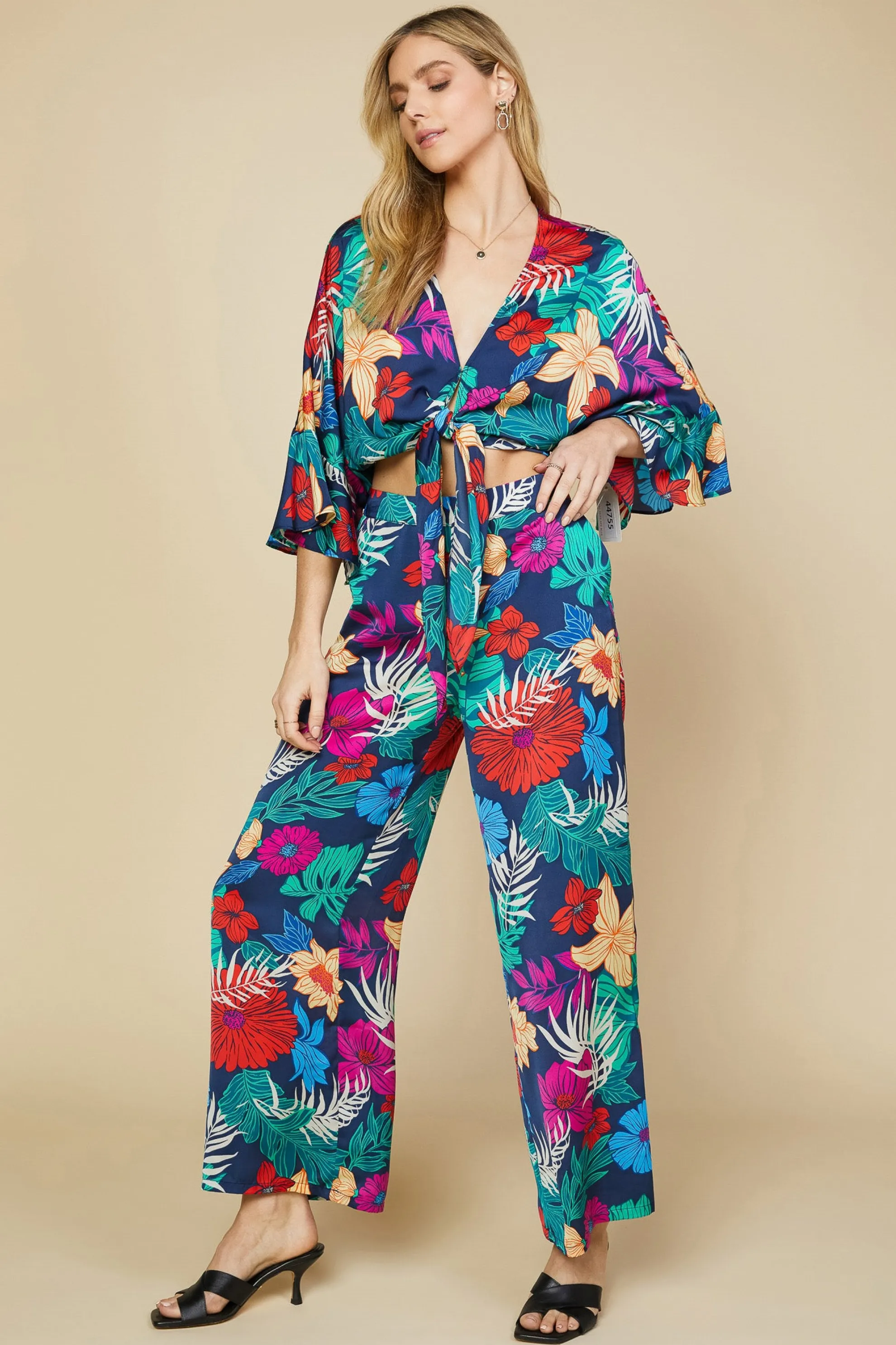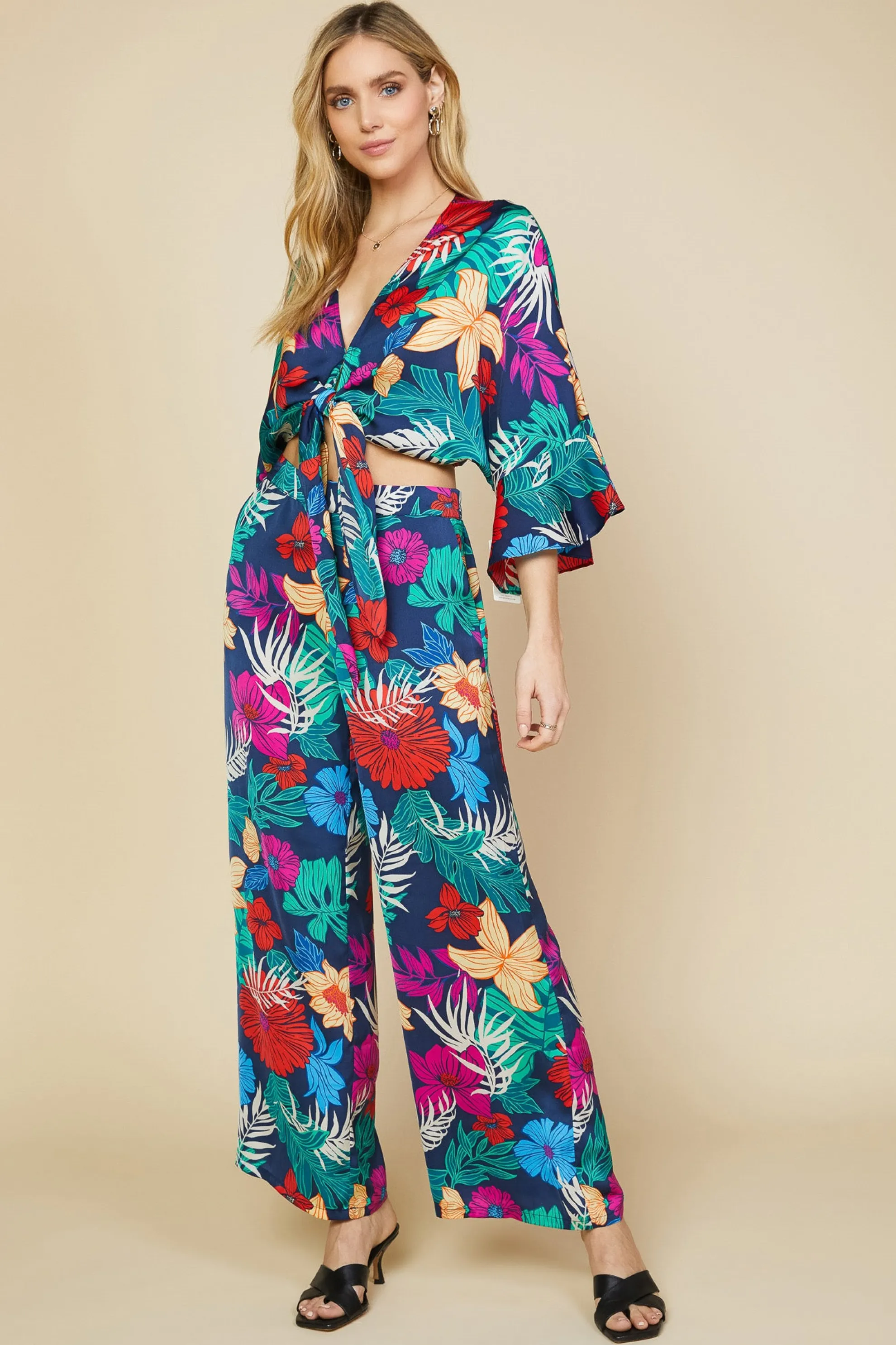 This tropical-print cropped kimono has beach getaway written all over it. It’s equally cute poolside or out in the city for dinner. Complete the look with our matching palazzo pants.