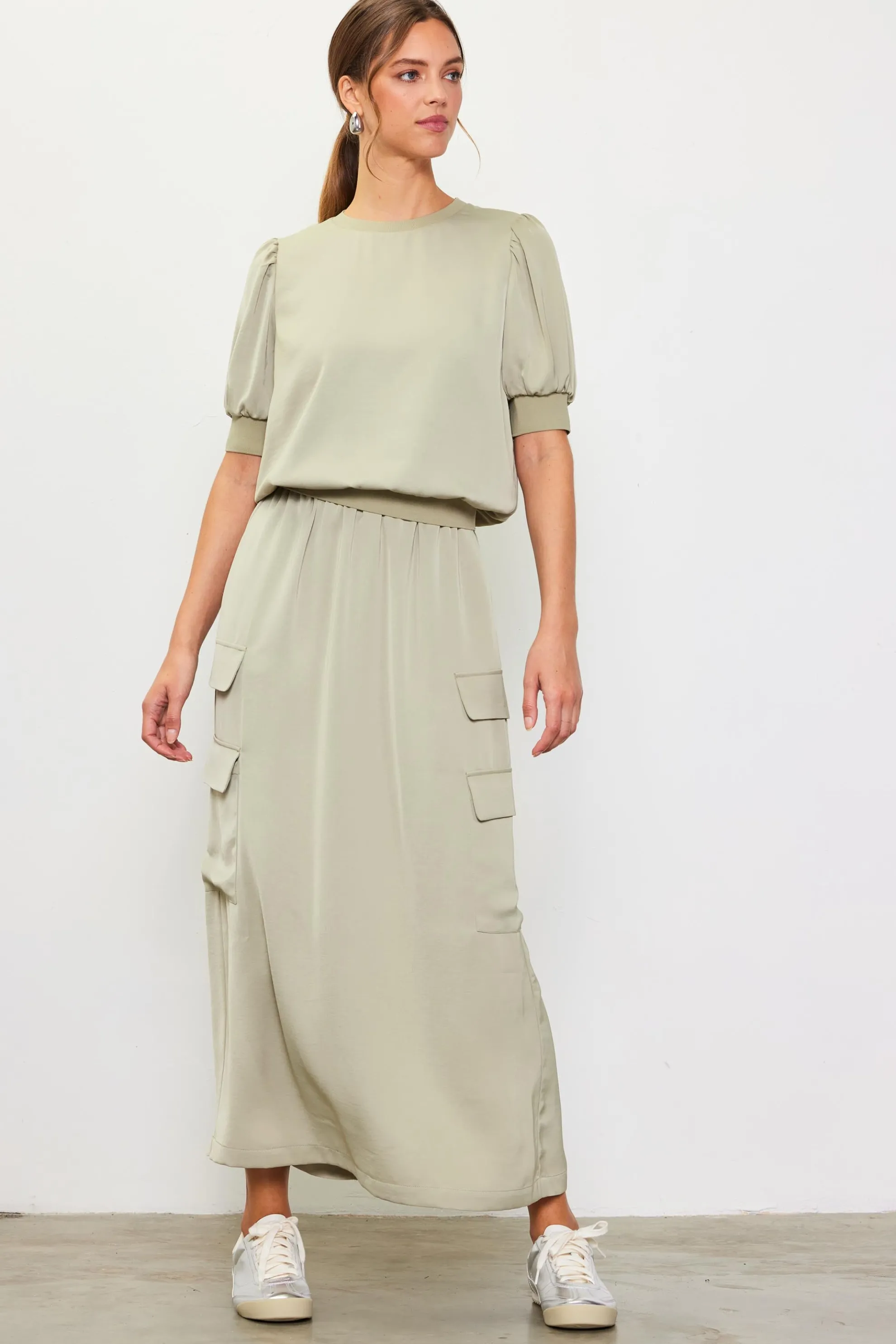 A slinky midi skirt you’ll want to live in. Adjusted by a metal-tipped drawstring, it’s got a comfortable elasticized waist and a relaxed shape that’s finished with multiple cargo pockets.