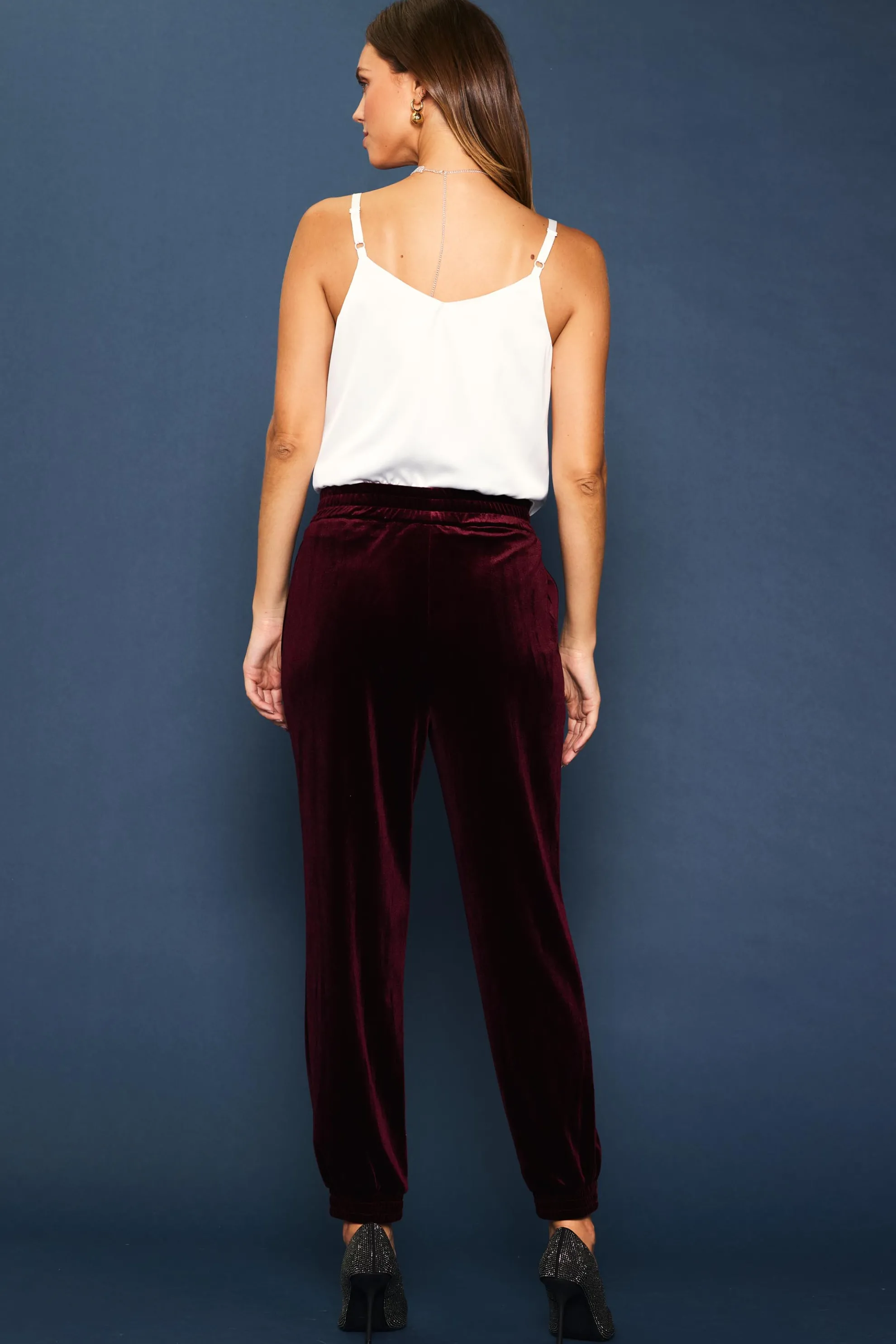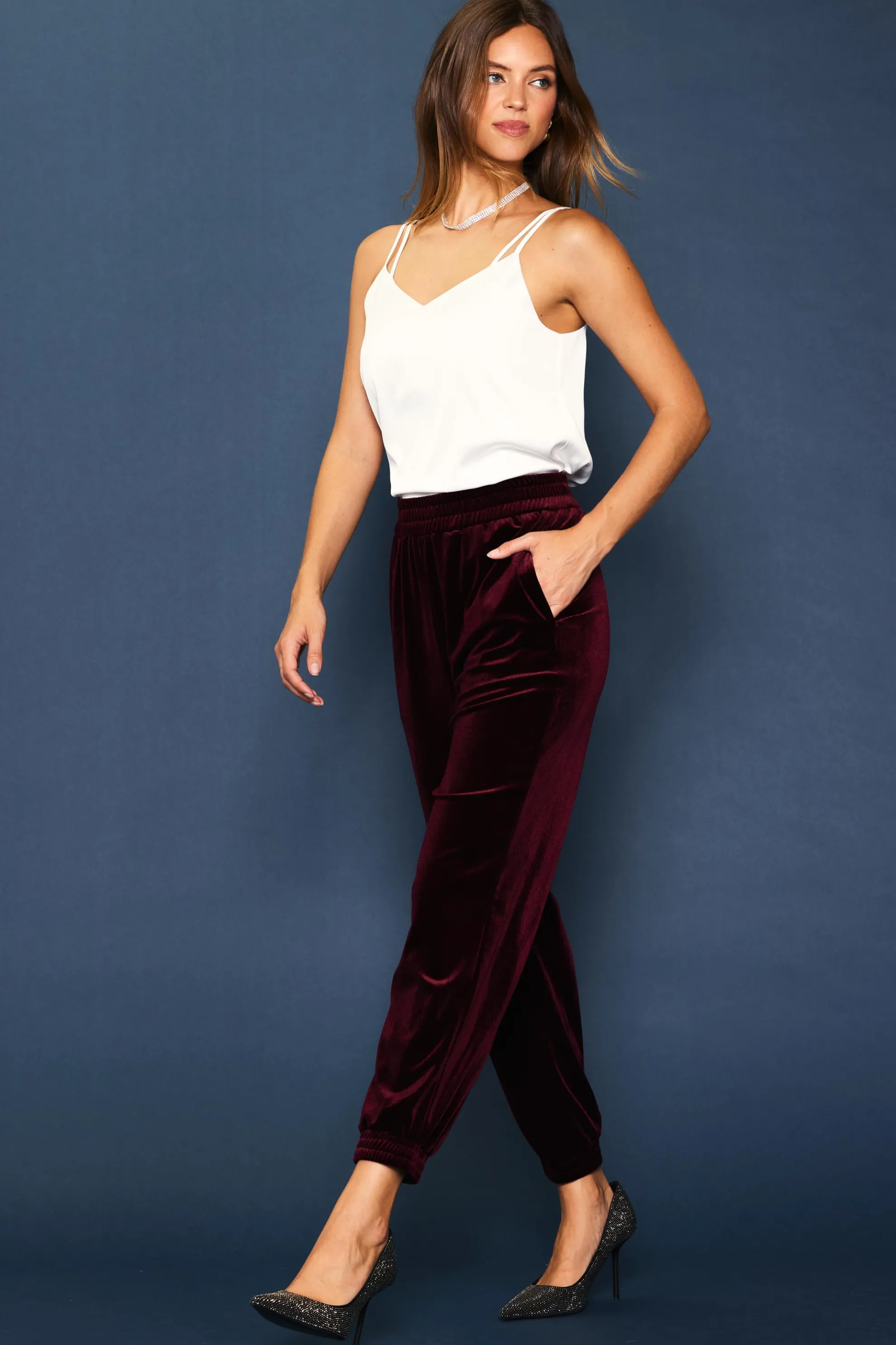 Soft velvet upgrades the essential jogger pant. Featuring an elasticized waist and a relaxed fit with cinched ankles, this lustrous pair can easily be dressed up or down. The look is luxe, the feel is lounge.